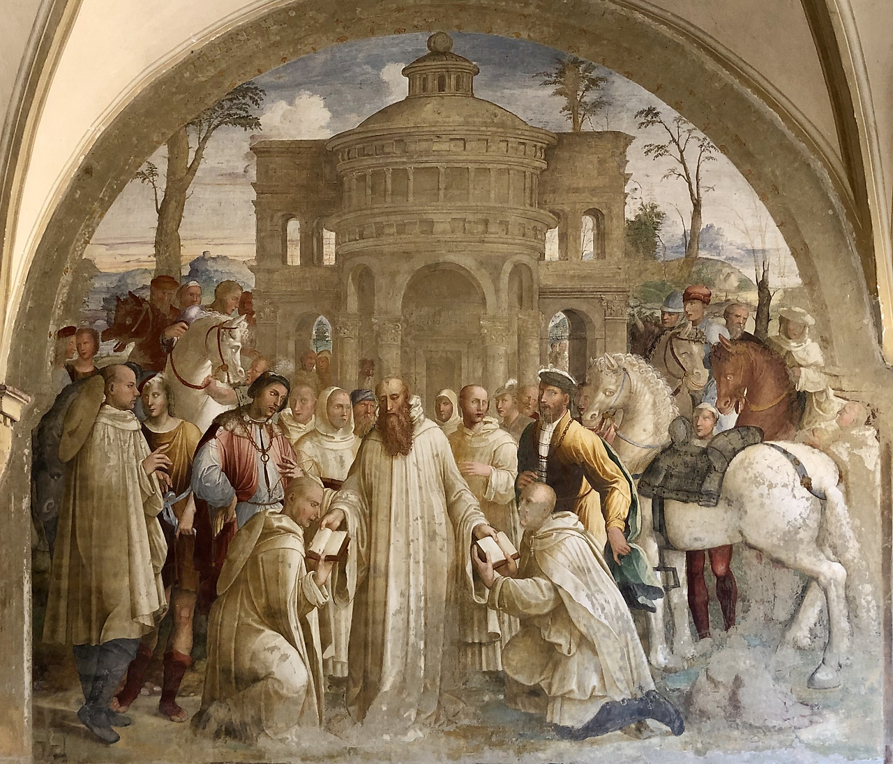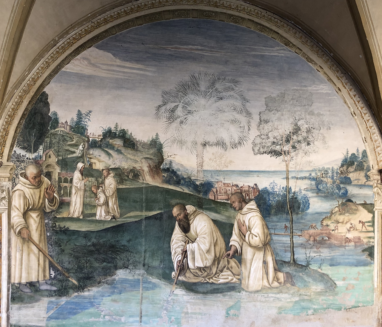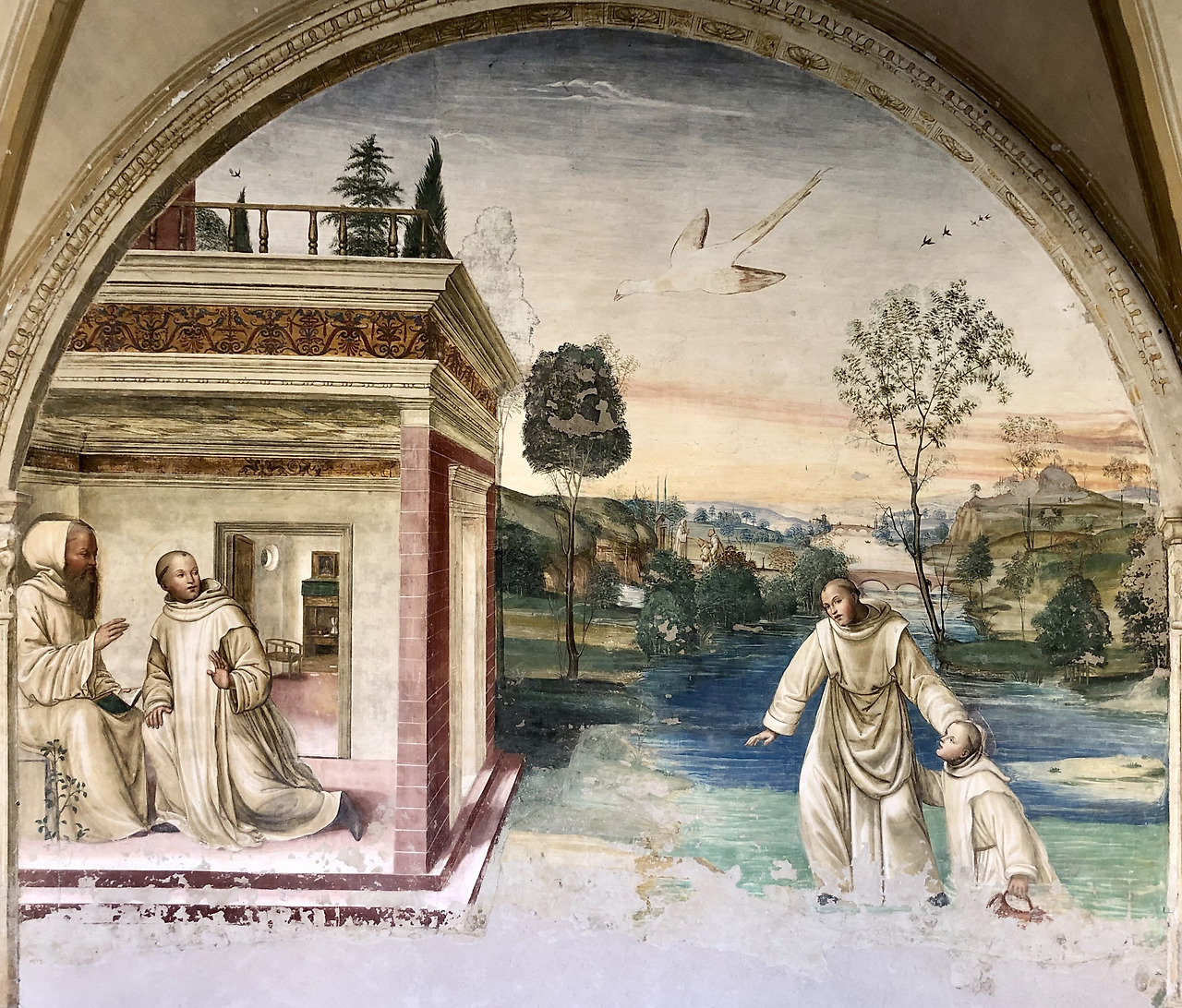 이 그림은 성인께서 선교를 위하여 플라치도는 시칠리아로 마우로는 프랑스로 파견하는 장면입니다. 하지만 시간순으로 볼 때 이 그림의 전후 내용의 그림과 아무 상관이 없는 장면입니다. 왜냐하면 플라치도를 파견한 것은 약 537년이고 마우로를 파견한 것은 약 546년이기 때문입니다. 547년 경에 성인께서 몬테카시노에서 선종하시기 때문에 사실 이 장면은 성인께서 선종하시기 전인 마지막 부분에 등장할 내용이라고 할 수 있습니다. 이 그림은 소도마의 공방에서 그림을 배우고 또 그의 사위가 된 일명 리쵸 (Riccio)라고 불리던 바르톨로메오 네로니 (Bartolomeo Neroni, 1505-1571)가 그렸습니다. 우리가 보기에 성인 왼편에 있는 사람은 프랑스 왕 샤를 5세이지만, 리쵸는 왕의 얼굴에 자신의 얼굴을 자화상처럼 그렸습니다. 이 그림은 1536년 이 수도원을 방문한 샤를 5세를 기념하여 그려졌습니다.