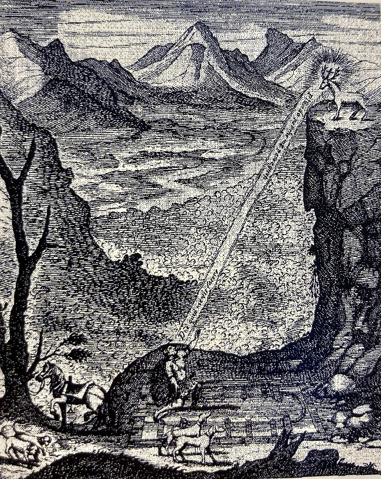 그림 설명 : 왼편 판화에는 예수님께서 "플라치도야 왜 나를 박해하느냐?"라고 묻자 "주님 제가 무엇을 하길 원하십니까"라고 플라치도가 답하는 장면이다. 오른편 사진은 미니어처에 그려진 성 에우스타키오의 회개와 기적이다. (13세기 미니어처, 출처: Wikimedia commons)