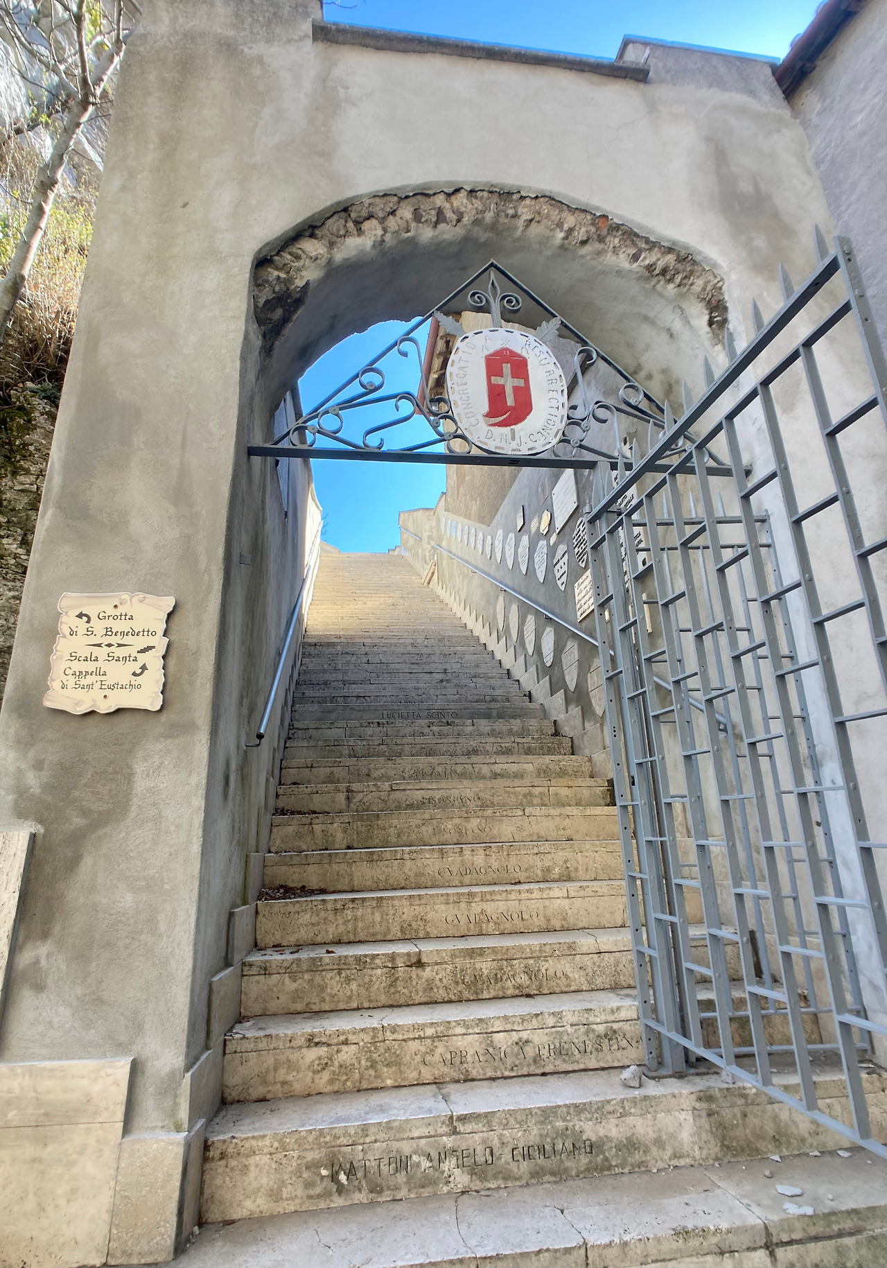 그리스도교로 개종한 콘스탄티누스 황제는 이곳을 방문하여 순교자인 에우스타키오 성인을 기념하여 주님께서 사슴뿔 사이에 당신 모습을 드러내신 장소에 오라토리오 (기도소)를 세우게 하였고 동시대 교황이었던 실베스트로 1세는 하느님께 봉헌하는 축성을 하였다고 합니다. 현재의 소성당은 17세기 중반에 다시 세운 것이고 에우스타키오의 회개와 순교에 관련된 프레스코화가 소성당 내부에 그려져 있습니다. 이 성당을 향해 올라가는 계단은 '거룩한 계단 (Scala Santa)'이라고 부르고 있고, 이것 역시 17세기 때 처음 만들어졌습니다. 소성당 옆에는 삼위일체를 상징하듯 세 개의 종이 달려있고, 그 아래에는 이 종을 쳐야 할지 말아야 할지 망설이게 만드는 의미심장한 글이 적혀있습니다.