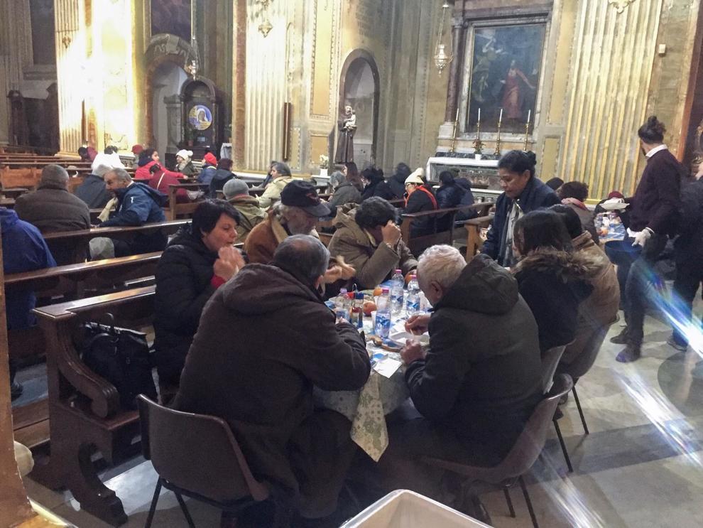 성당 정면 위에는 에우스타키오 성인이 멘토렐라에서 본 사슴 머리 위에 십자가를 만들어 놓았습니다. 이 성당 지하에는 에우스타키오 성인이 살았던 로마 시대의 유적들이 있고 아마도 이곳에서 성인은 그 당시 로마에 들어왔던 가난한 사람들, 특히 로마 제국 주변에서 온 외국인들을 불러 모아 하루에 필요한 음식을 나누어 주었을 것입니다. 성인이 가난한 사람들에게 도움을 준 것을 기억하며 지금도 하루의 음식이 필요한 사람들을 위해 120명분 정도의 음식을 준비해서 성당 내에서 하느님의 사랑을 나누고 있는 귀한 장소입니다. 그래서 이 성당은 '가난한 사람들의 식당'이라고 불리고 있습니다.