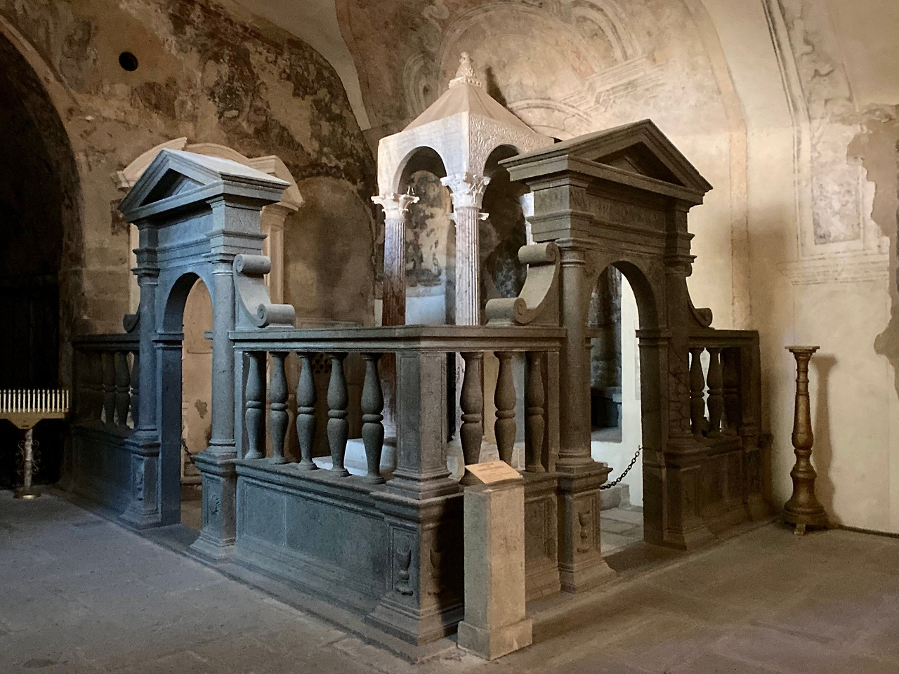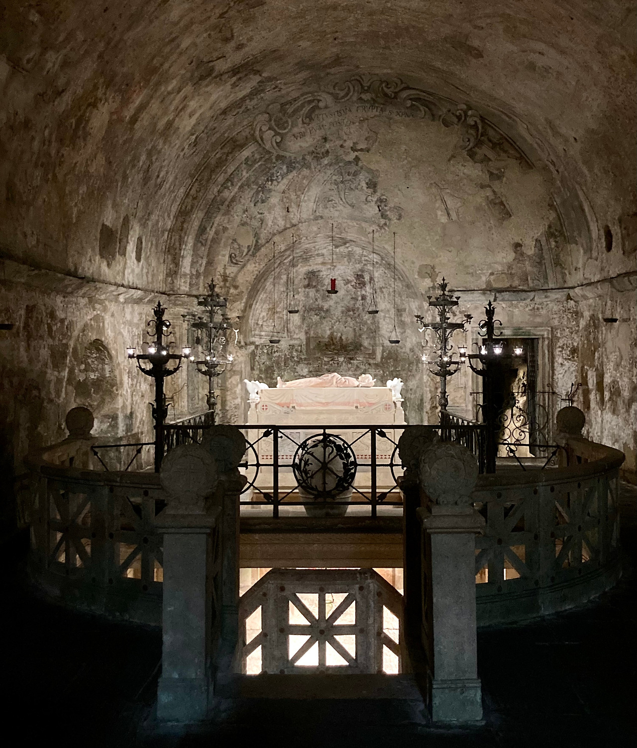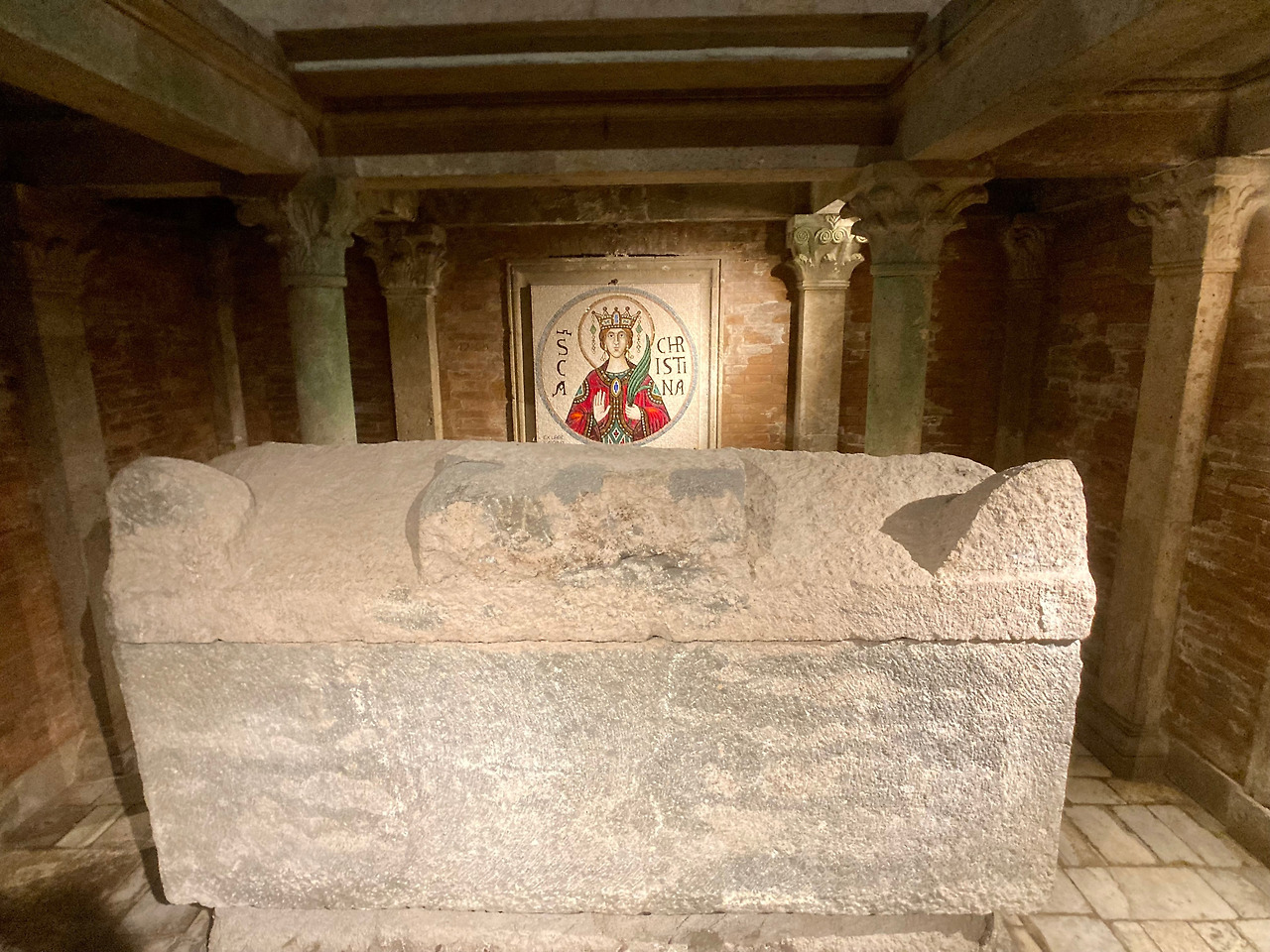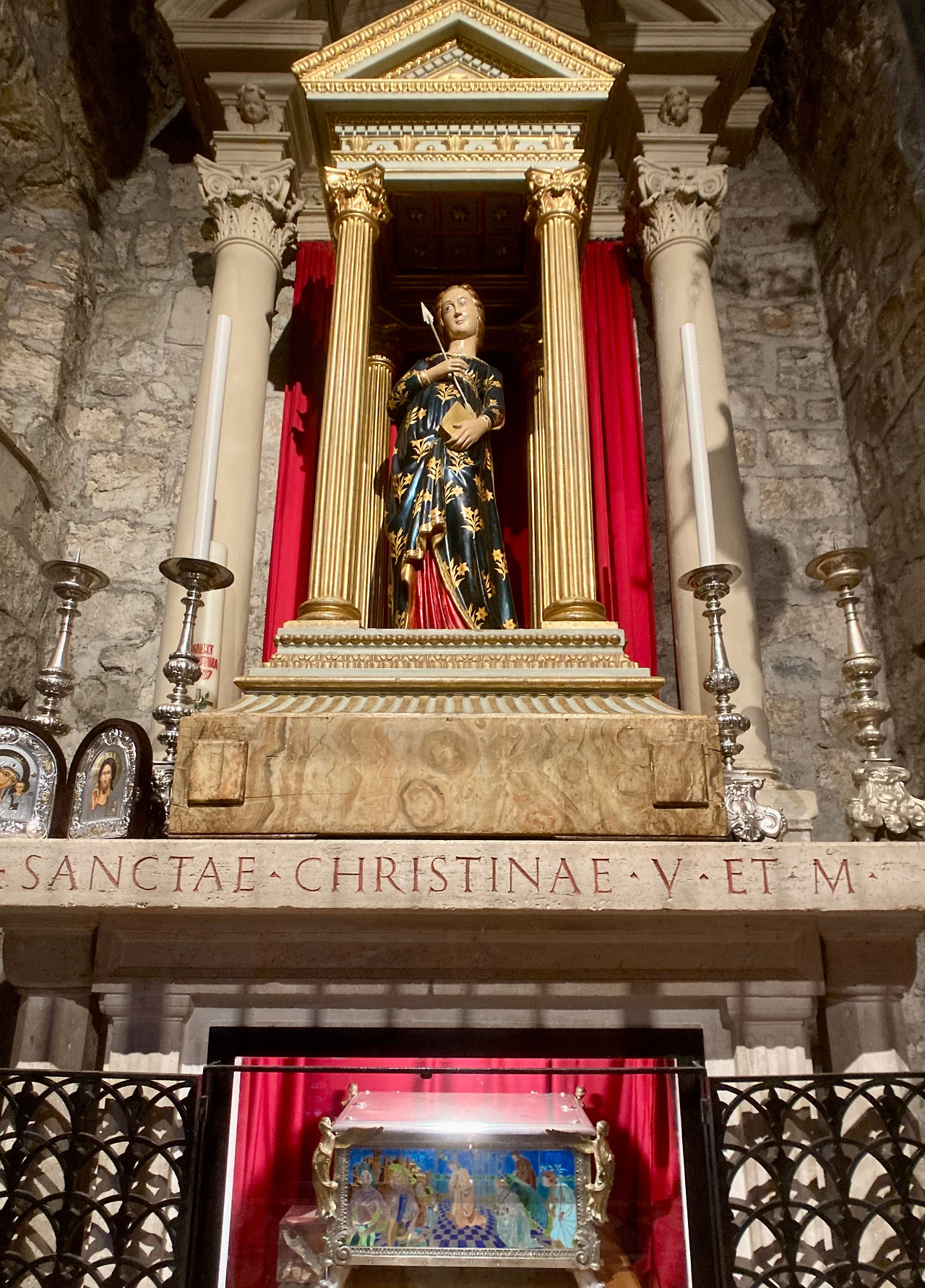 성녀의 무덤을 둘러싼 대리석과 철제 구조물들은 1880년도에 만들어진 것이고 성녀의 석관 위에 있는 기념대와 순교의 증거물인 화살과 맷돌을 감은 줄을 목에 메고 편안하게 잠들어 있는 성녀 크리스티나의 조각은 베네데또 불리오니 (Benedetto Buglioni, 1461-1521)(1)가 만들었습니다.
