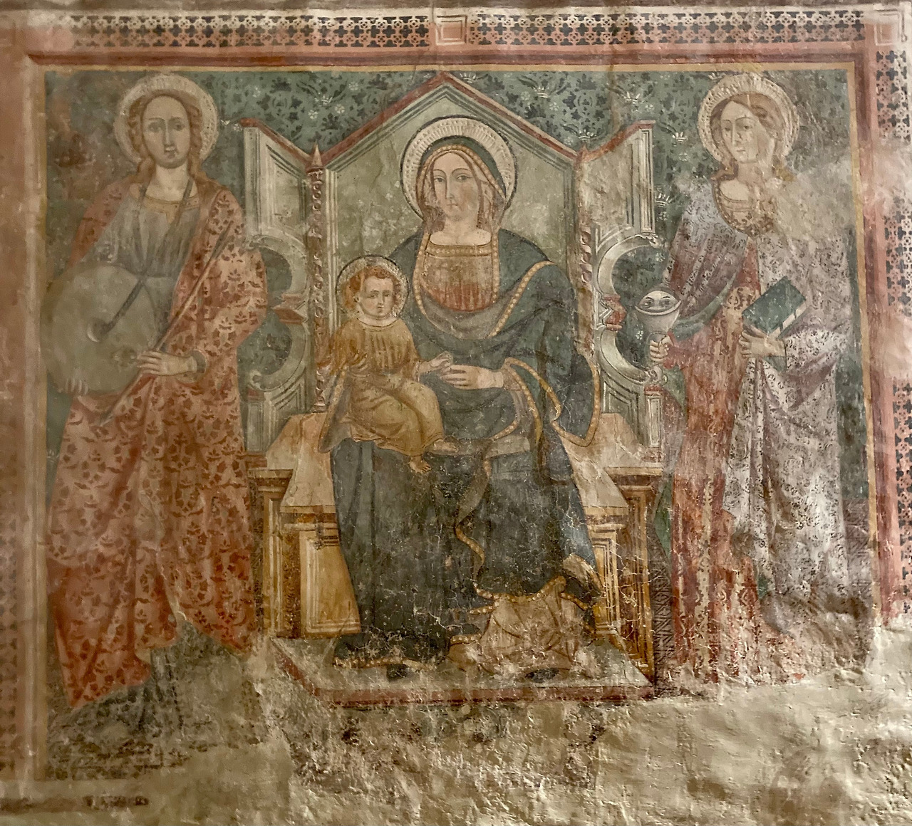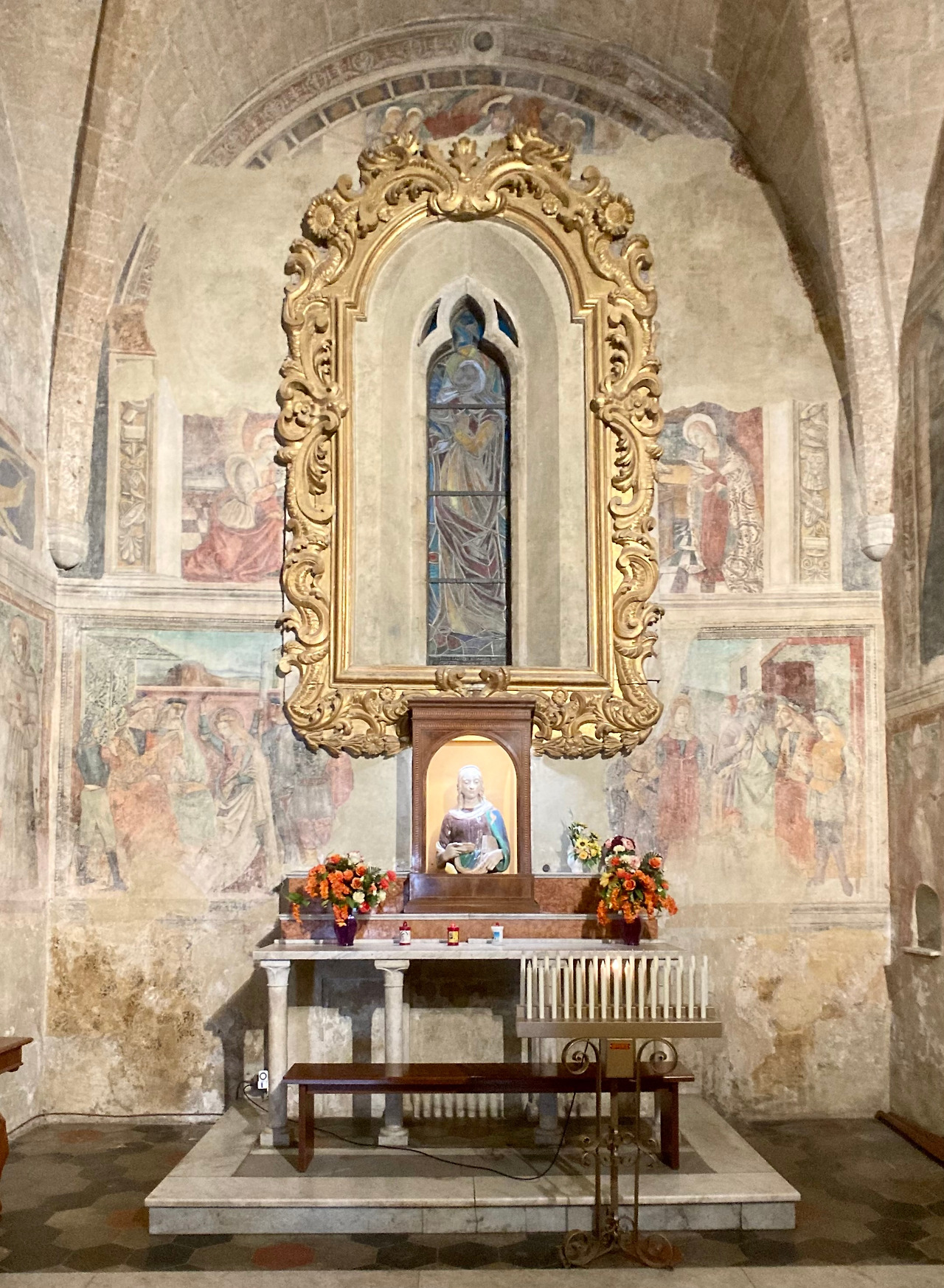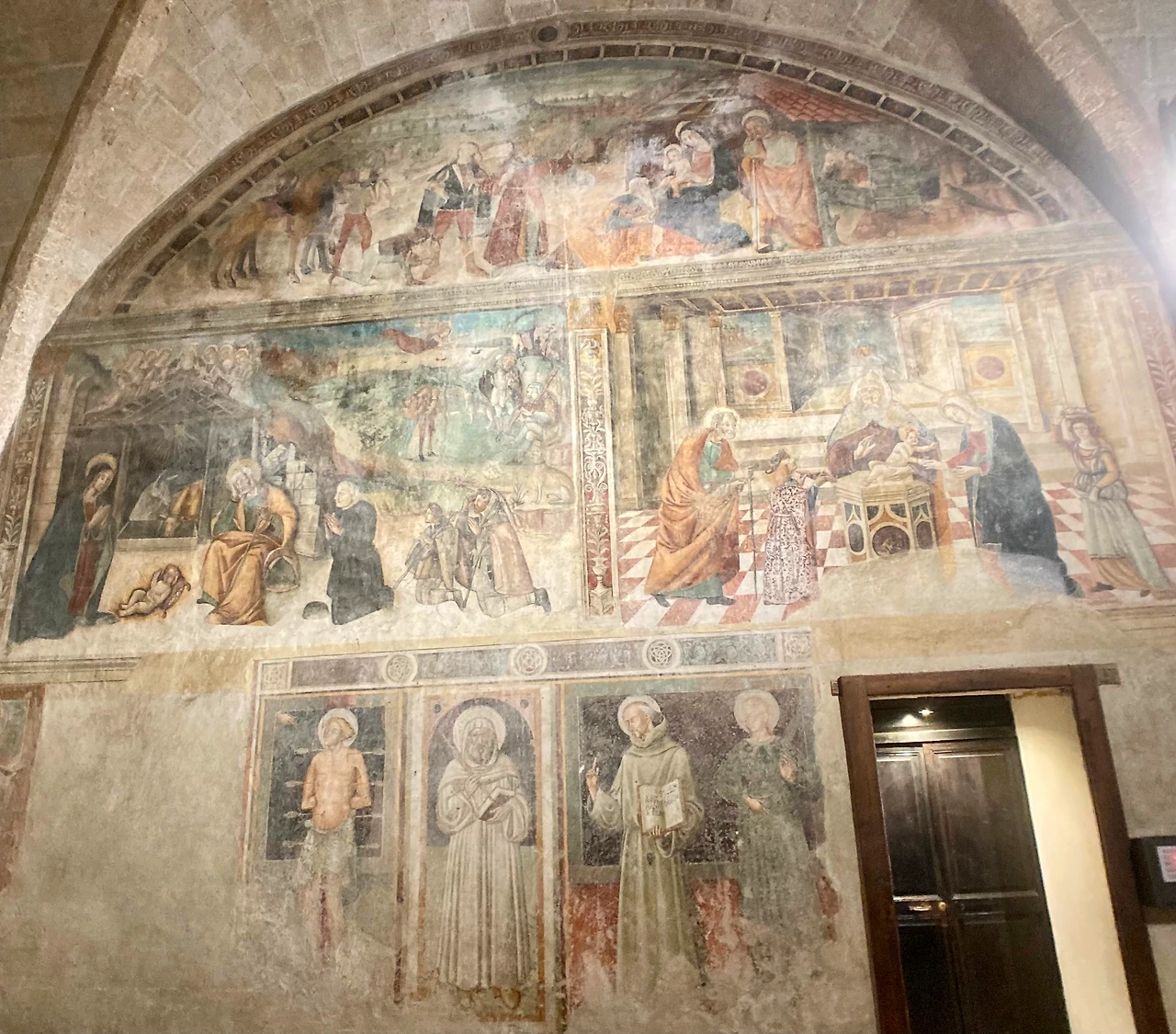 이 소성당의 프레스코화들은 가브리엘 천사가 마리아의 방문부터 부활까지 중요한 예수님의 이야기가 그려져 있습니다. 이 그림들은 1498년 피에몬테 지방 사람이었던 조반니 디 도메니코 데 페라리스 (Giovanni di Domenico de' Ferraris)가 그렸습니다. 아기 예수님 탄생 그림 안에는 다른 탄생 그림과는 다르게 두 명의 순례자가 함께 있는 것이 인상적입니다. 프란치제나 길을 통해 다니던 많은 순례자들에게 이 성당은 꼭 기도하고 순례해야 하는 중요한 장소임을 잘 보여주는 장면입니다. 소성당 입구 오른편에는 아기 예수님과 옥좌에 앉아있는 성모 마리아와 함께 맷돌을 매고 있는 성녀 크리스티나와 자신의 뽑힌 눈을 들고 있는 성녀 루치아의 모습이 있습니다.