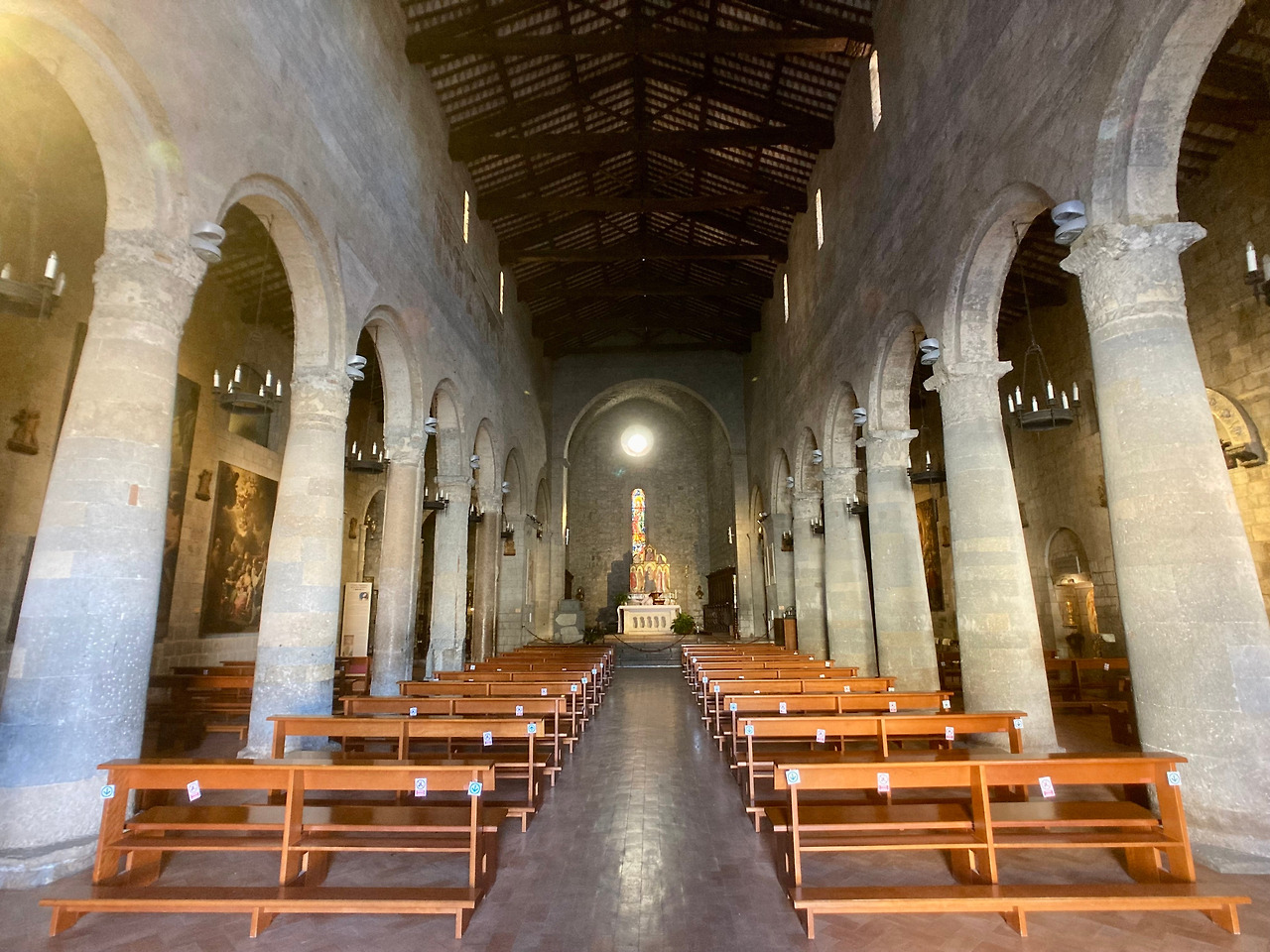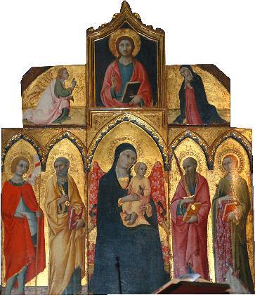 중앙 제단에는 여러 장의 패널을 접이식으로 붙여 그리는 폴립틱 양식으로 된 제단화가 있습니다. 15세기 중반 시에나 사람이었던 사노 디 피에트로 (Sano di Pietro)가 그린 것으로 중앙에 아기 예수님을 안고 계시는 성모 마리아가 앉아있고 오른편에는 성 바오로와 성녀 크리스티나, 왼편으로는 성 베드로와 성 조르조가 서있습니다. 앉아 계시는 성모님이 서 있는 성인들보다 더 크게 그려진 것이 특징입니다. 그 위로는 왼손에 성서를 들고 오른손으로 축복하시는 그리스도와 양옆 성모영보를 뜻하는 가브리엘 천사와 마리아가 있습니다.