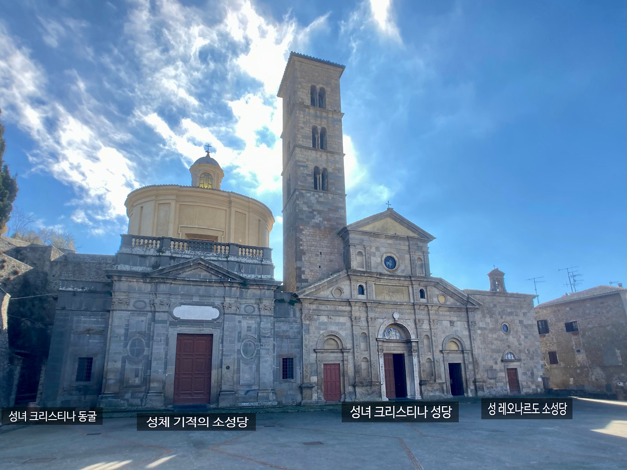 성문을 지나 프란치제나 길을 따라 걷다 보면 볼세나 중심 도시에서 조금 벗어난 곳에 있는 성녀 크리스티나 대성당을 볼 수 있습니다. 광장에서 바라본 성당 정면은 마치 세 개의 성당이 함께 있는 것처럼 보이지만, 이중에 중심이 되는 것은 종탑과 함께 있는 성녀 크리스티나 성당이고 나머지는 이곳에 붙여서 만든 소성당입니다. 하지만 눈으로 확인이 잘 되지는 않지만 이 장소에서 가장 오래되고 중요한 네 번째 성당이 왼편에 하나 더 있습니다.