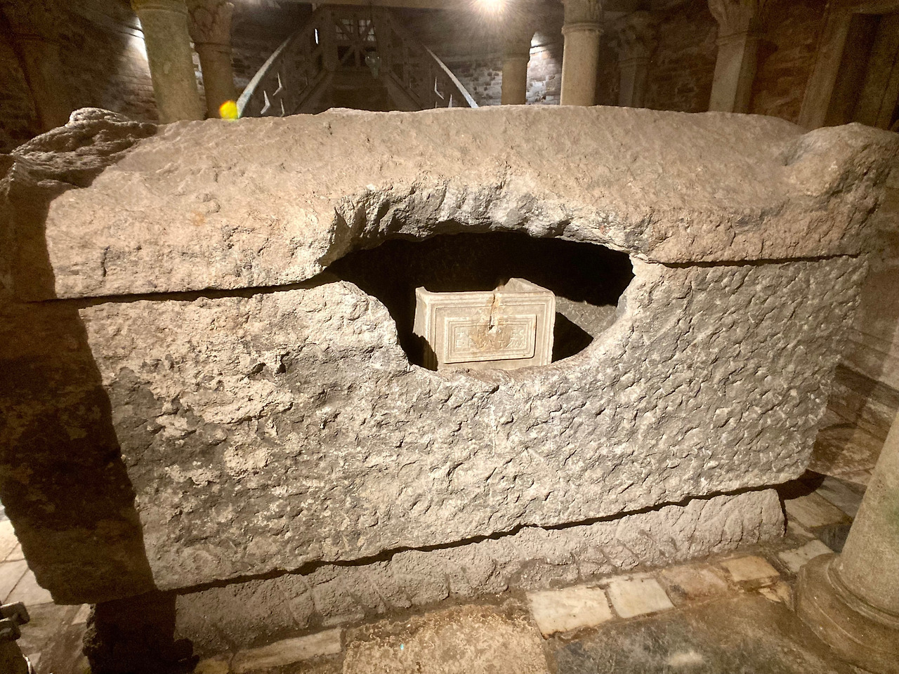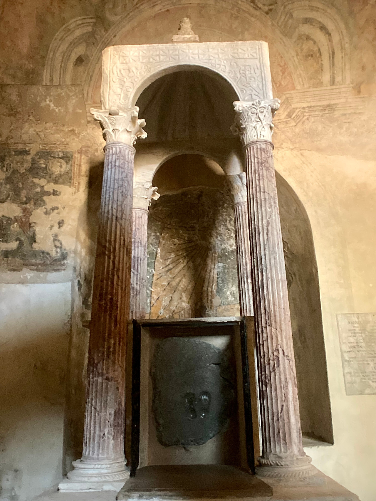 전승에 의하면 프란치제나 길 위에 있던 성녀의 유해는 순례자들에게 많은 공경을 받기는 했지만, 한편으로는 광신자들에게 도굴의 대상이 되기도 하였습니다. 그래서 성녀의 유해를 안전하게 지키기 위한 목적으로 볼세나 호수 안에 있는 작은 섬 마르타나 (Martana)에 한동안 숨겨져 있었습니다. 그러던 중 성녀의 유해를 카노사의 마틸데 (Matilde di Canossa, 1046-1115)가 마르타나 섬에서 찾아 옮겨왔고 이때 성녀의 무덤 위에 크리스티나의 동굴 성당을 봉헌하며 대리석으로 된 아름다운 정문을 만들었다고 합니다. 지금 이 대리석 기둥이 있는 문은 크리스티나 대성당에서 기적의 소성당으로 들어가는 입구에서 볼 수 있습니다.