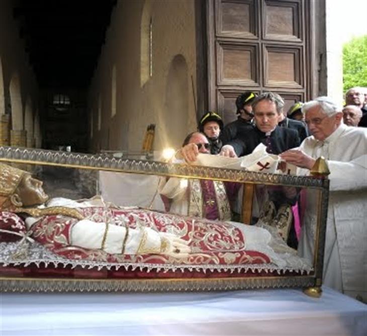 △ 사진 설명 : 첼레스티노 5세 교황 탄생 800주년을 기념해 교황 베네딕도 16세 교황이 2009년 아퀼라시에 있는 콜레마조의 성 마리아 대성당을 방문하여 첼레스티노 5세 교황 유해 위에 자신이 교황 즉위식에 착용했던 팔리움을 봉헌하고 있다. 아이러니하게도 베네딕도 16세 교황은 첼레스티노 5세 교황을 이어 살아생전 교황직에서 사임한 두 번째 교황이 되었다. (사진 출처 : vita.it)