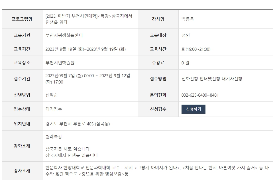 이번 하반기 부천시민대학은 오는 9월 5일부터 10월 24일까지 운영하며, 3개의 시민학습원 (부천·송내·고강시민학습원)에서 총 9개 프로그램이 진행될 예정이다.