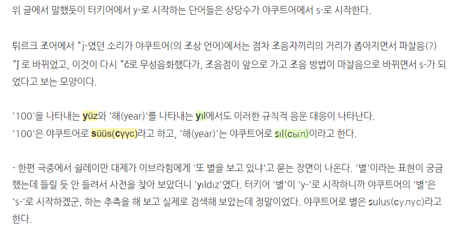 공통 튀르크어에서는 'year'라는 말이 j-로 시작하는데 야쿠트어에서는 s-로 시작한다는 것이다.