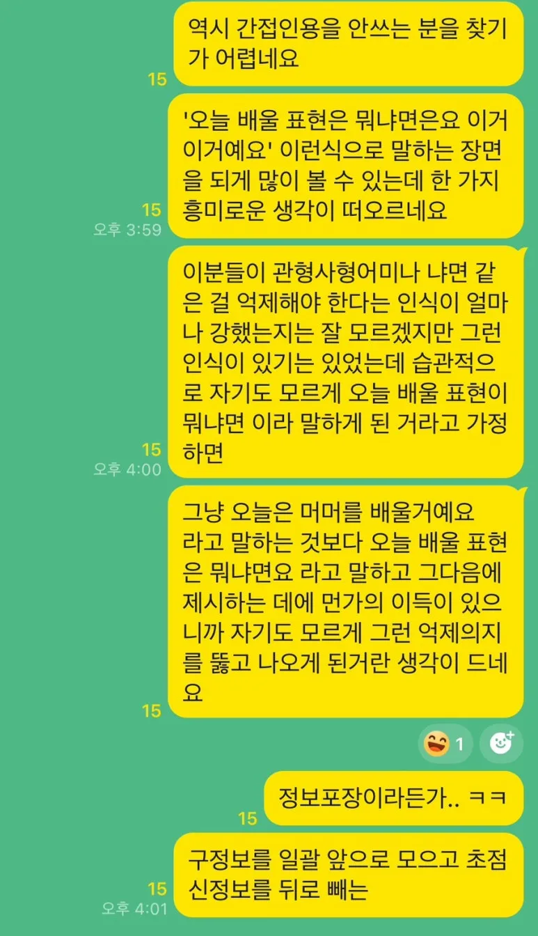 "방금 간접인용문 사용하셨는데 학습자가 못 알아듣겠죠?",