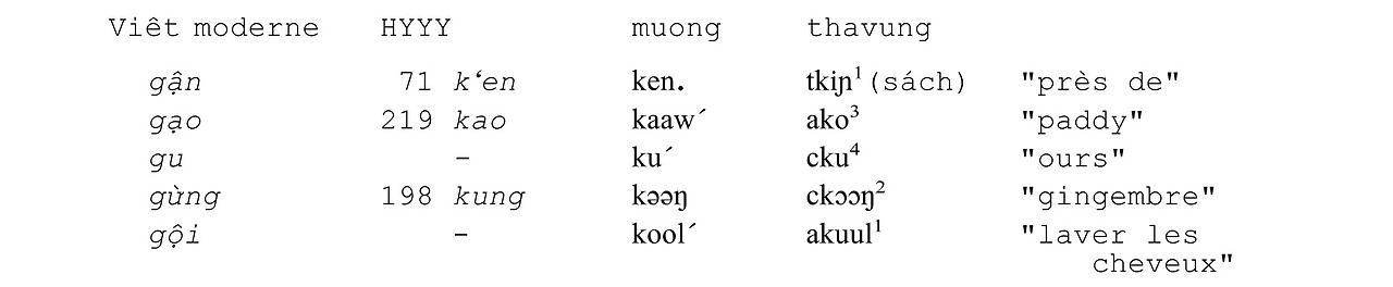 맨 오른쪽 타븡어는 대부분 어두자음군을 갖고 있고, 맨 왼쪽 현대 베트남어는 어두에 <g>로 적히는 마찰음을 갖고 있다.