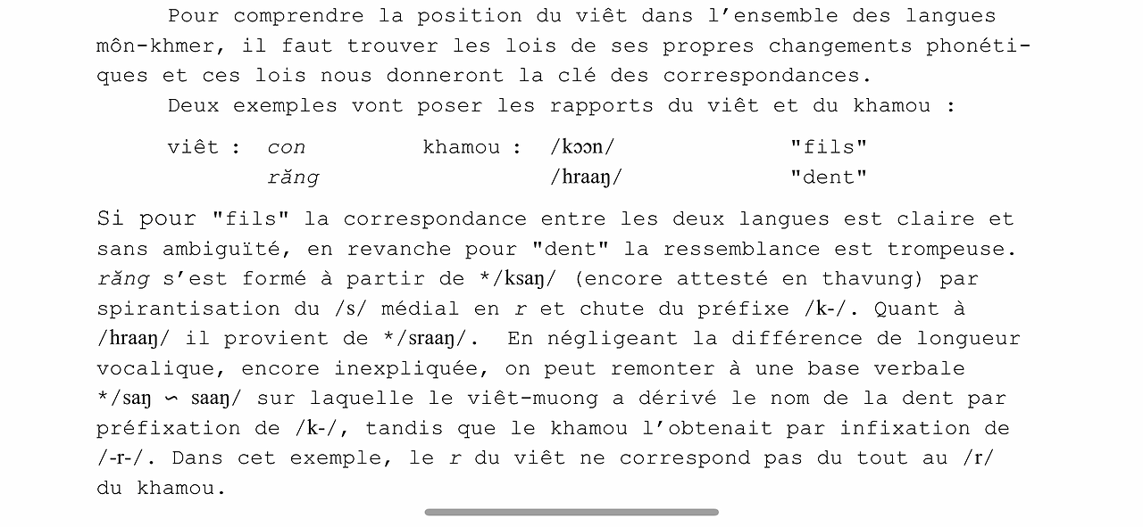 논문의 맨 앞부분이다. 크무어의 'hraaŋ 이빨'과 베트남어의 'răng 이빨'은 서로 어원이 같지만, 크무어 단어의 -r-과 베트남어 단어의 r-은 '상동(homologous)'이 아니라는 내용이 매우 흥미롭다.