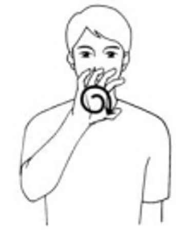 - 얼굴 아래에 붙어 있는, 꼭대기가 뾰족한 집 모양(?)은 모든 손가락을 서로 붙인 채로 편 손모양(수형)을 뜻한다.