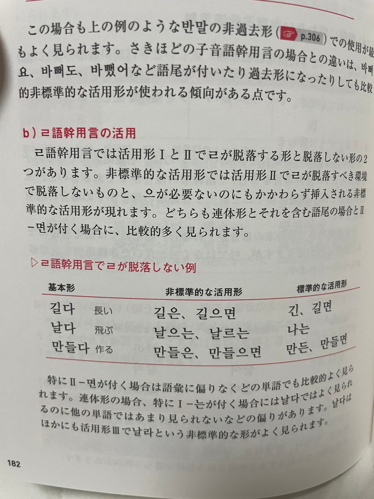 전에 일본 여행을 갔다가 키노쿠니야 서점에서 구매한 NHK출판 <これならわかる韓国語文法: 入門から上級まで>에는 한국어 모어 화자들이 즐겨쓰는 비표준 활용형들이 잘 소개되어 있는데, 그 중에 'ㄹ어간 용언'의 비표준 활용형으로는 '길은', '날으는' 등이 등장한다.