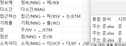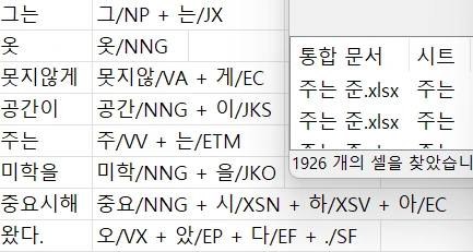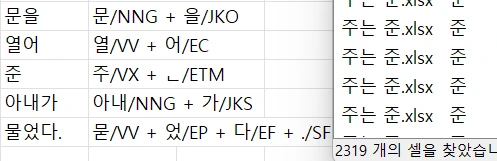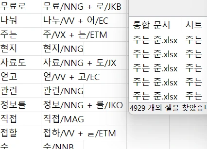 '주/VX + 는/ETM'으로 보조동사 '주다'의 활용형 '주는'을 검색한 결과는 무려 4,929개나 되었다.