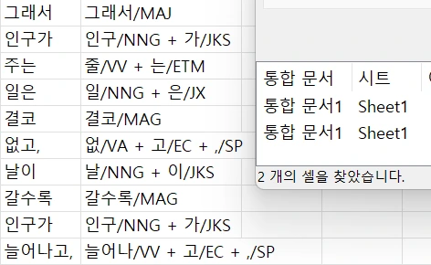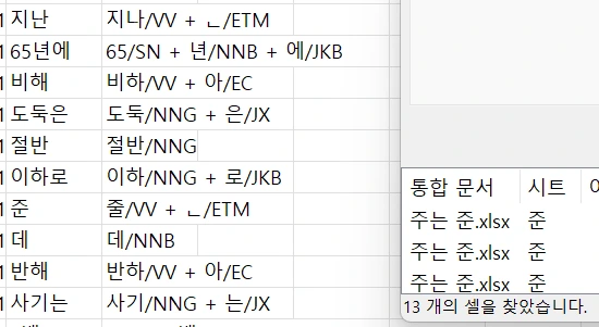 하여튼 같은 방법으로 '줄다'의 활용형을 찾아 보니(줄/VV + 간/ETM) 총 13개가 검색되었다.