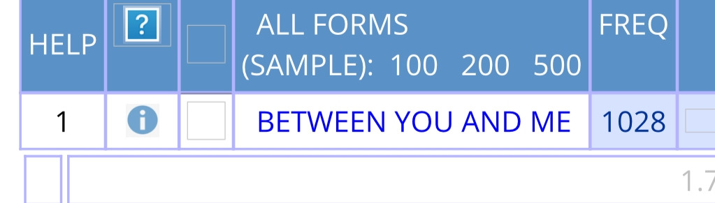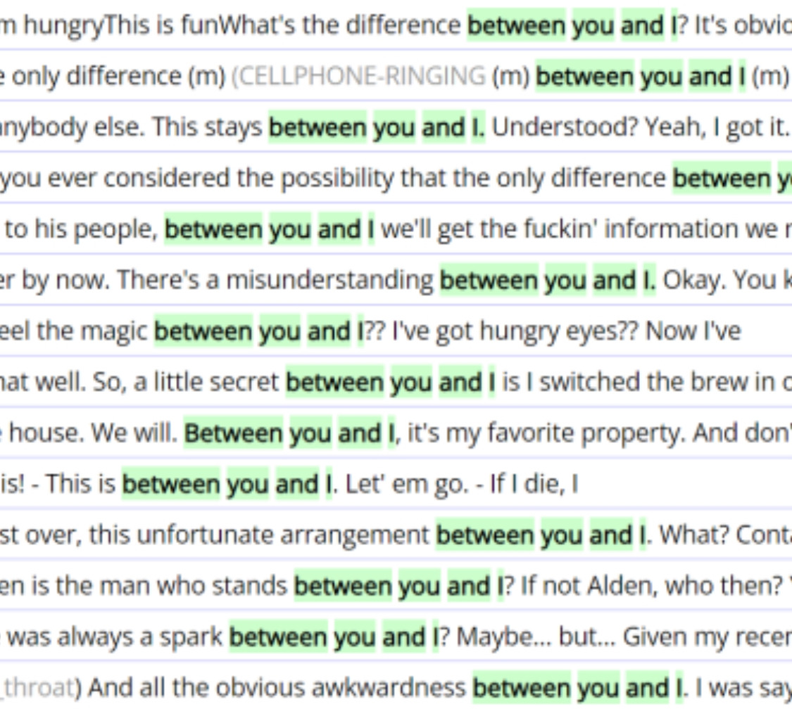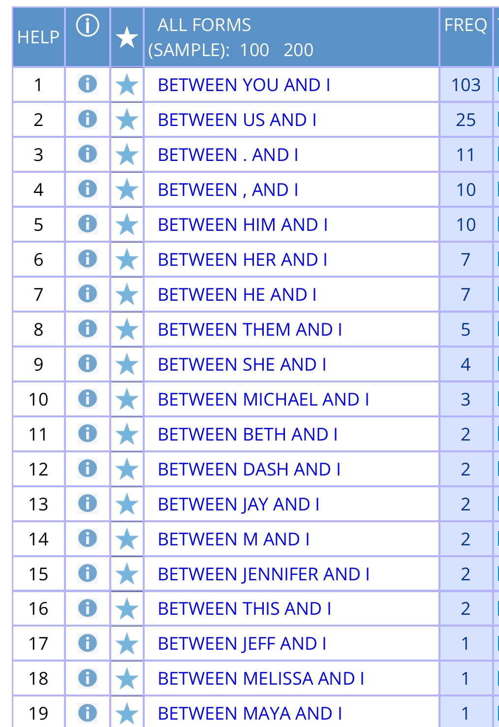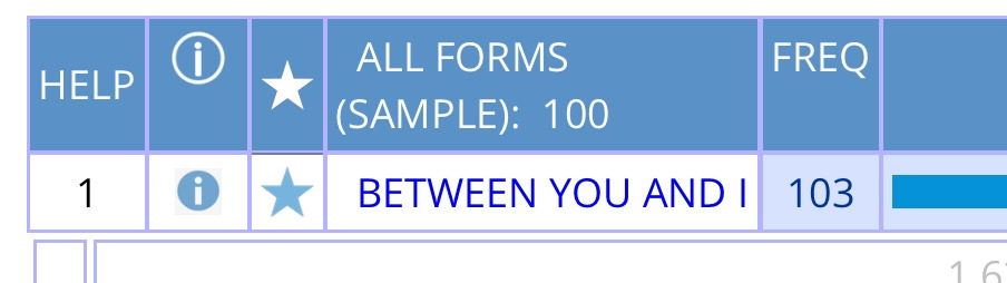 +5 COCA 기준, 'between you and me'는 'between you and I'보다 약 열 배 더 자주 쓰인다.