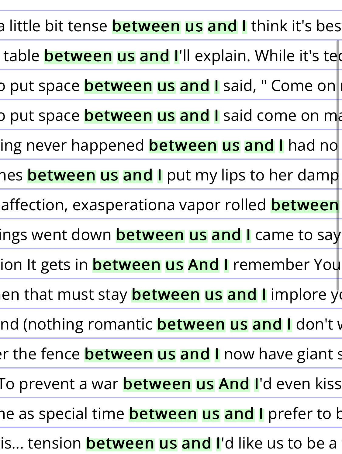 ’between * and I'로 검색하면 'between us and I'도 나오는데, 의미를 생각하면 짐작할 수 있겠지만 이 경우 I는 between의 보충어에 속하는 게 아니라 새로운 절의 주어로 쓰이는 것이다.