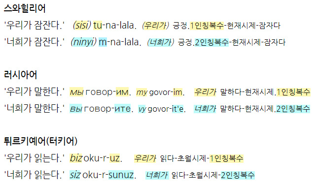 만약 내가 머리를 자를* 때 스와힐리어나 러시아어나 터키어로 (또는 라틴어, 스페인어, 불어 등으로) 대화를 했다면, 소음 때문에 헤어디자이너 님 말에서 주어를 잘 못 들었더라도 서술어에 나타나는 주어 인칭수 일치 정보를 통해 주어가 1인칭 복수(헤어디자이너 님 쪽 커플)인지 아니면 2인칭 복수(우리 부부)인지를 한 번 더 파악할 수가 있었을 것이다.