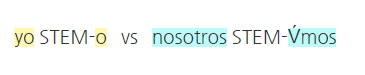 현재시제 직설법 1, 2인칭 복수형 동사 어미들은 강세를 받고 심지어 1인칭 복수형 어미는 음절이 두 개나 들어가는 -V́mos 형식으로 되어 있다.