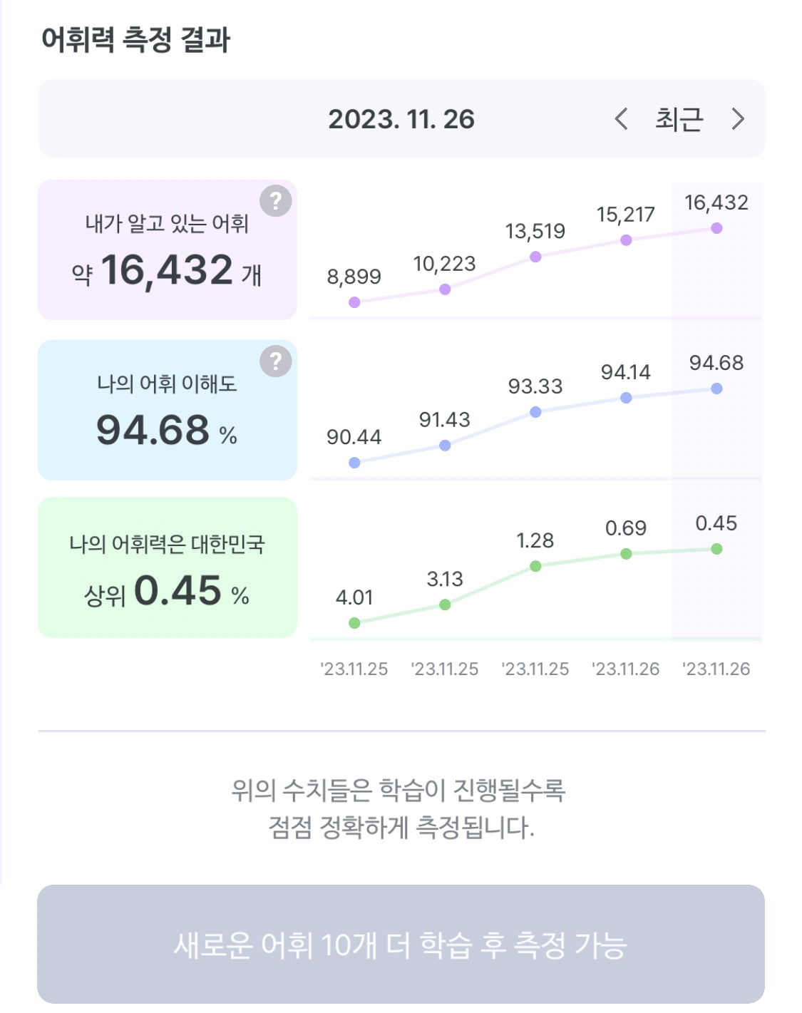 말해보카 어플에서는 제 영어 어휘력이 대한민국 상위 0.5%에 속한다고 말해주고 있습니다. 그동안 이런저런 아쉬움을 겪으며 조금씩 키워온 제 알량한 인정욕구를 자극해 주는 이 문구가 솔직히 약간 마음에 듭니다. 결제를 유도하는 개발사 측의 전략인지는 모르겠습니다.