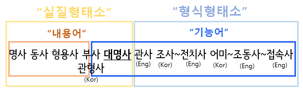 내가 이 글과 위 그림에서 ‘대명사가 실질형태소/기능어’라고 말하는 건 모든 언어에 공통적으로 있는 보편 범주로서의 대명사가 그렇다는 게 아니라, 국어문법학계와 영어문법학계가 국어와 영어의 대명사를 각각 그렇게 분류하더라 하는 말일 뿐이다.