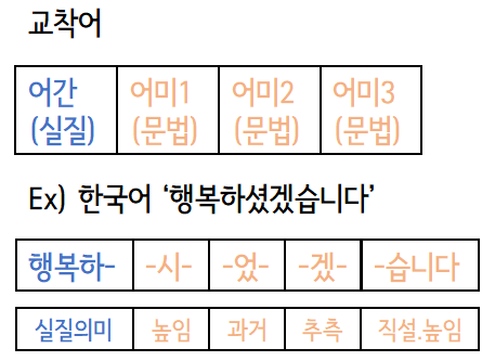 교착어에서는, 실질적인 의미를 나타내는 부분(실질형태소-어간)에 문법적인 의미를 나타내는 부분(형식형태소-어미?)이 여러 개 붙어 하나의 단어를 만든다.