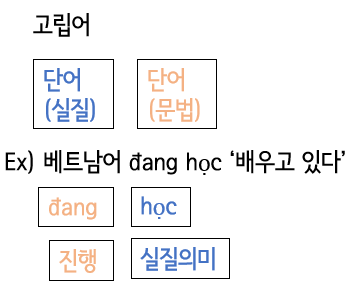 고립어(분석어)인 베트남어에서는 진행 의미를 나타내는 문법형태소 đang이 '배우다(học)'와는 별도의 독립 단어로서 '배우다' 앞에 자립적으로 나타나는 것이다.