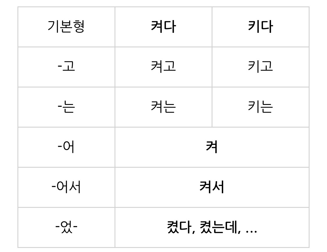 '키다'의 활용형 '키- + -어 = 켜'는 어간 말 모음 'ㅣ'와 어미의 모음 'ㅓ'가 이중모음 'ㅕ'로 축약된 것이다.