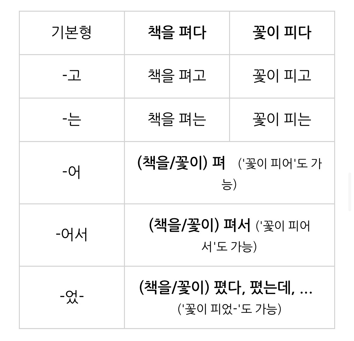 나를 포함한 우리 세대에서 흔히 쓰이는 '불을 키고', '책을 피고' 등의 어형이 등장한 데에는 아마도 이러한 배경이 있었을 것이다.