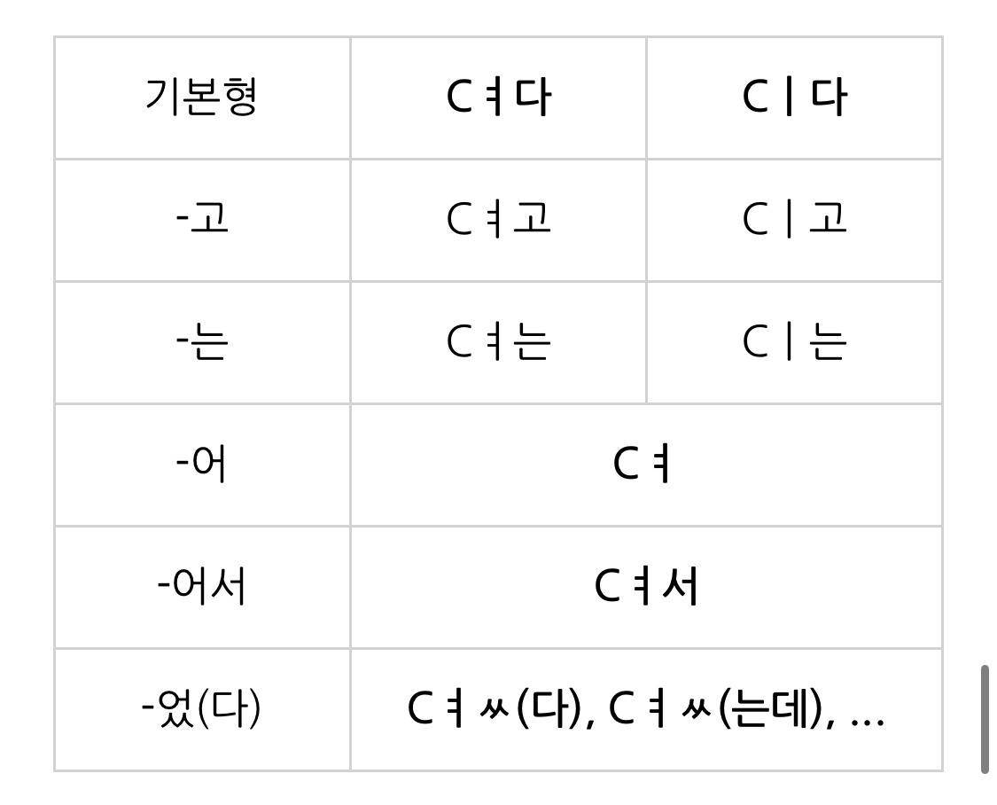 위 표에서 왼쪽에 등장하는, 어간이 이중모음 '-ㅕ'로 끝나는 용언은 개수가 그다지 많지 않아 보인다.