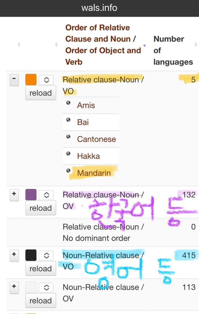 한마디로, 중국어(의 방언들)와 그 영향을 강하게 받은 언어들을 제외하고서는 전세계에서 동사-목적어(VO) 어순을 지니면서 관계절을 명사 앞에 위치시키는(Rel-N) 언어가 아직까지 보고된 바 없다. (적어도 WALS에는 올라 있지 않다.)