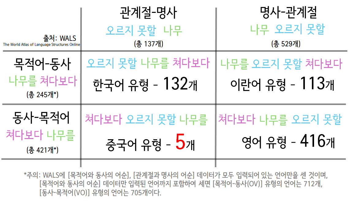 - 중국어처럼 '쳐다보다 - 오르지 못할 - 나무를' 순서로 표현하는 언어는 전세계에 겨우 5개밖에 없기 때문이다. (VO & Rel-N)