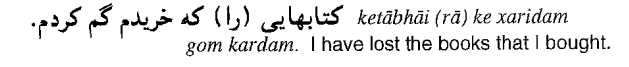 [ketābhāi 책들] [rā 을] [ [ke 관계대명사] [xaridam - 내가 샀다] ] [gom kardam - 내가 잃어버렸다]