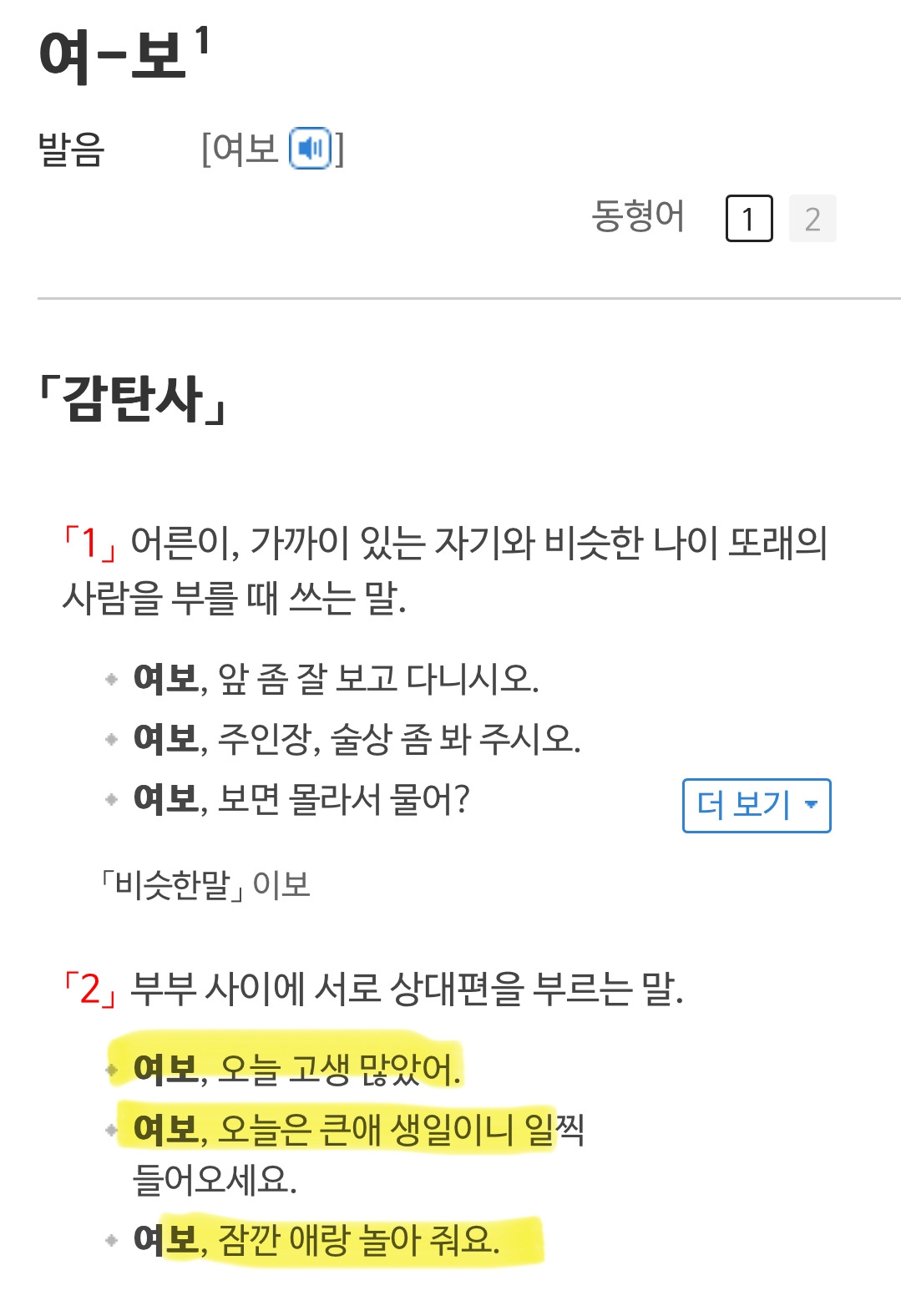 + ‘여보’의 뜻을 如寶라고 푸는 글도 검색 중 발견했는데, 틀린 어원이지만 재미는 있다.