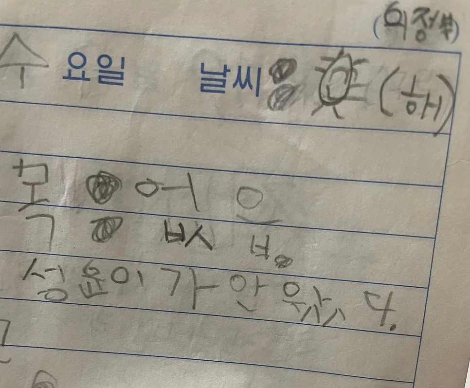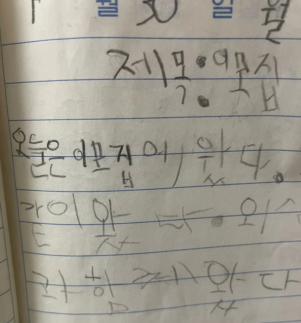 ‘왔다’라는 말에 들어 있는 이중모음 ‘ㅘ’를 다섯 살(?)의 내가 ‘ㅜㅏ’로 적은 게 흥미로워서 찍은 사진이고 그래서 임시저장해 둔 건데,