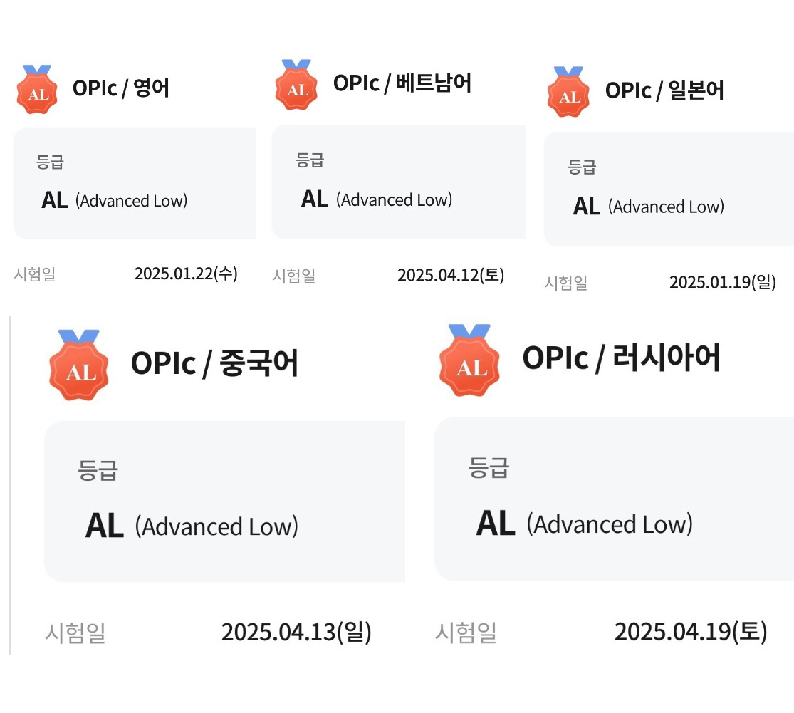 이로서 2025년 상반기에 영어, 일본어, 중국어, 러시아어, 베트남어 다섯 개 언어로 OPIc AL 성적을 수집하는 데에 성공했다.