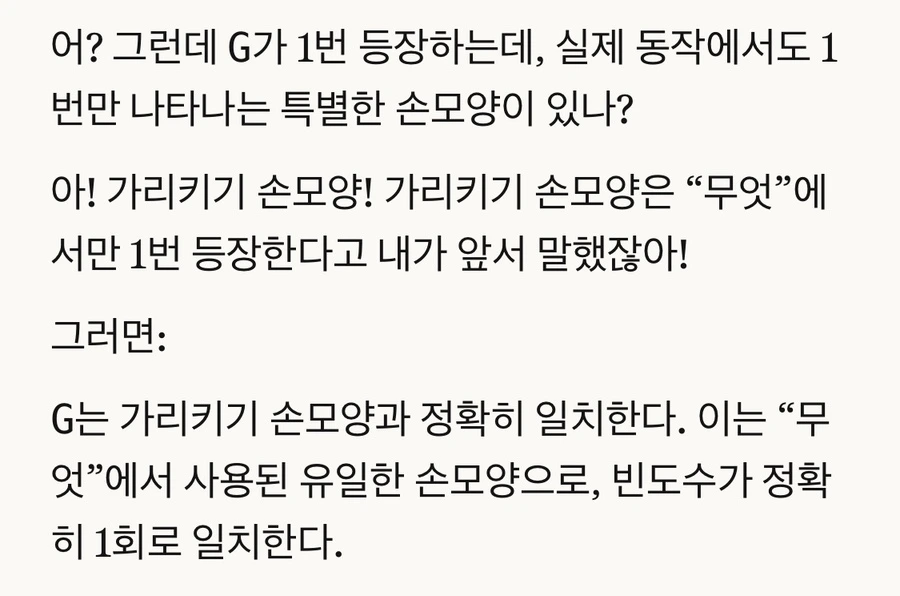 이 퍼즐은 우선 문자 중에 ‘G’가 유일하게 딱 한 번 등장하고 ‘무엇’의 손모양 또한 수어 음운 자질 중에 유일하게 딱 한 번 등장한다는 사실을 파악하여 연결짓는 것이 중요하다.