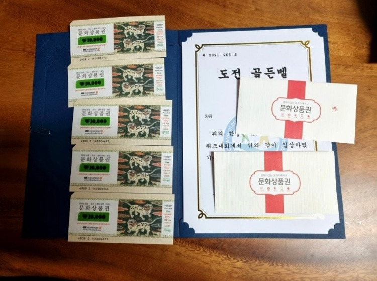 열어보니, 문화상품권 1만 원짜리 다섯 장이 나란히 나란히. "도전 골든벨" 어쩌고 저쩌고, 지난번 학교에서 퀴즈 대회가 있었고, 3위를 했고.... 자랑하고 싶은 티가 잔뜩이다. 그 마음, 왜 모르겠나.