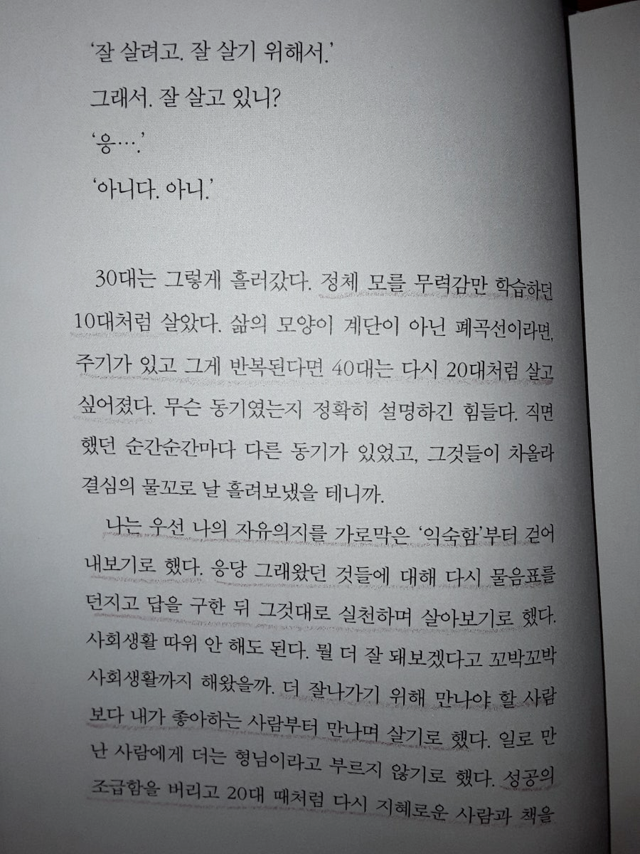"숱한 철학자들이 알려준 인간다움을 대학 도서관과 고시원 침대에서 이해하며 스스로 대견해했지만, 회사에서는 비인간적인 질서에 스스럼없이 편입해왔다. 또 많다, 이런 것들. 셀 수 없이. 20대에 발아한 자유의지는 지혜로 무성한 30대를 기약했지만, 결국 나는 고작 이 정도의 어른으로 자랐다."