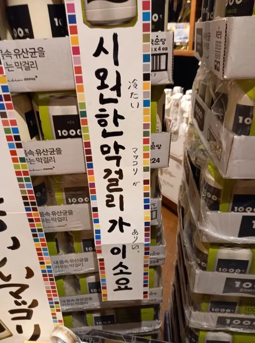 한국산 제품을 파는 가게에서 이렇듯 한글표기가 늘고 있다. 이러한 배경에는 한국산 제품임을 알리는 수단으로 한글표기를 적극적으로 사용하기 때문이다.판매상품에 한글을 표기한다는것은지금의 일본에서는 '엣지있게' 보이게 하는 효과적인 방법인 것이다. 그리고 매출에도 도움이 된다. 나처럼 막걸리 홍보물의 한글이 눈에 띄어 막걸리를 사지 않는가. 오늘은 가게 점원의 한국어 실력을 안주로 시원한 막걸리를 마신다.