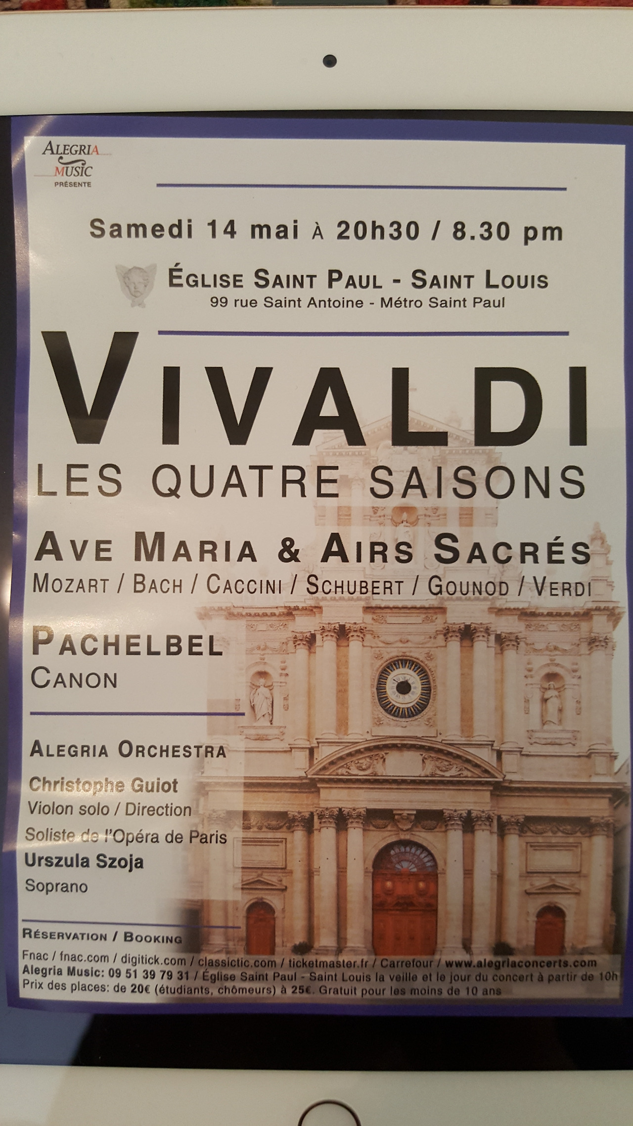 5월의 어느 토요일 밤, 내가 사랑한 마레지구, St. Paul 생폴 생루이에서는 Alegria 알레그리아 오케스트라 챔버와 소프라노 Urszuka Szoja 공연이 있었습니다. 비발디의 사계와 아베마리아 협연이었어요.