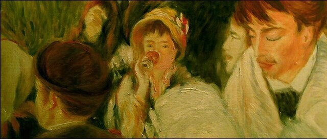 모두가 행복해 보이는 이 그림. 무리 속에 있지만 마음이 딴 데 가 있어서 도무지 표정을 잡을 수 없다는 뒤쪽에 앉아 물 잔을 들고 있는 이 여자. 영화 속 재밌는 두 사람(아멜리에와 레이몽)은 이 여인에 초점을 맞추며 이야기를 풀어간다.