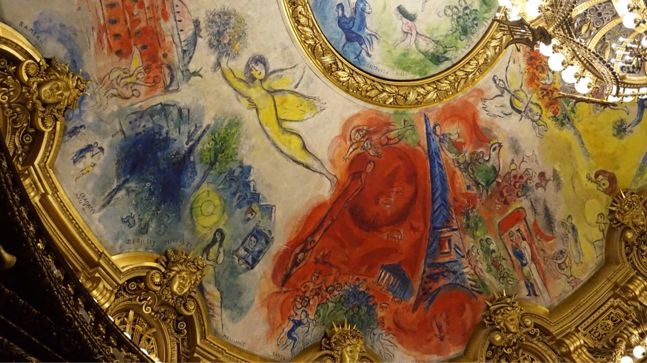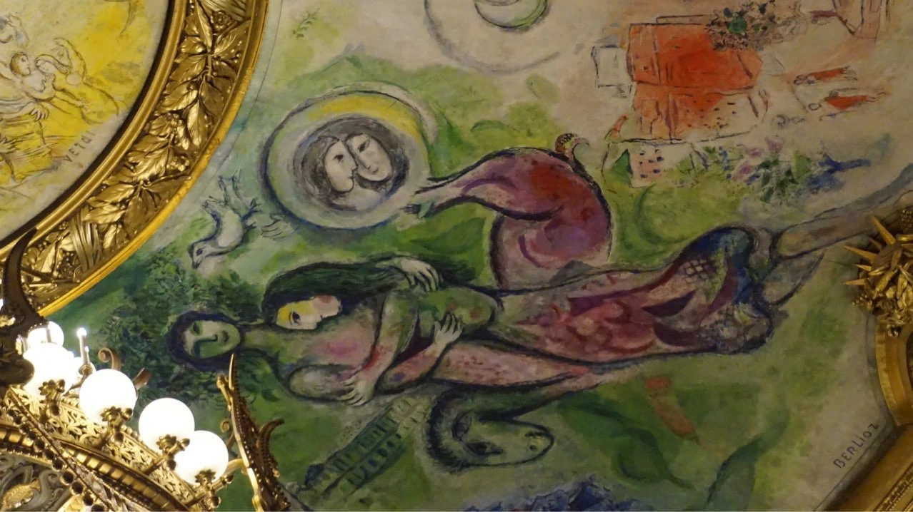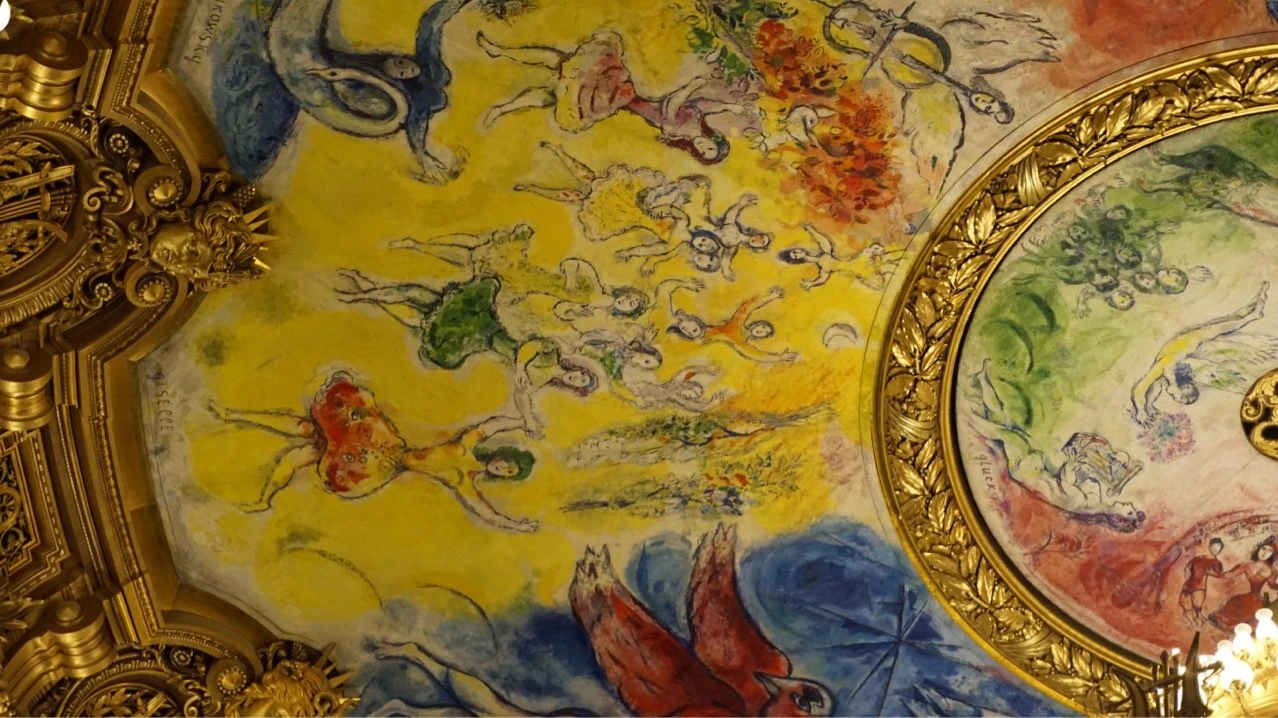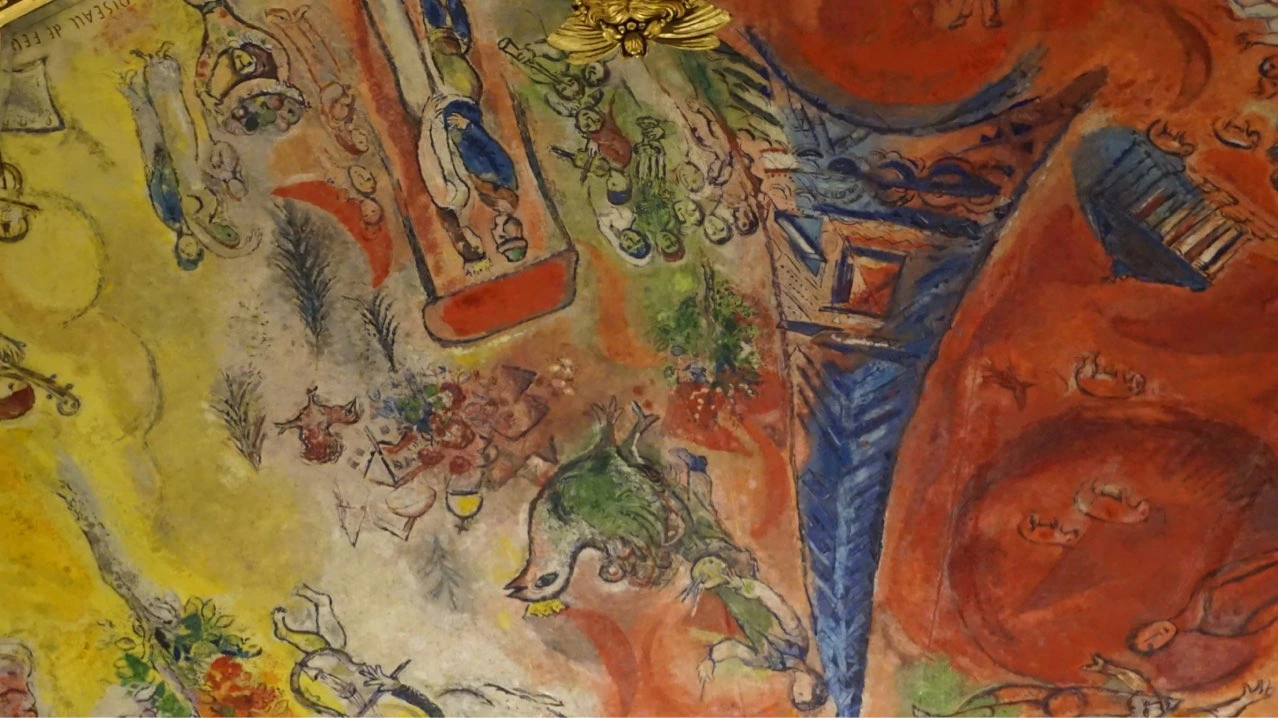 샤갈 자신이 이 천장화를 가리켜 “꿈의 꽃다발”이라 불렀다. 그의 색은 물감을 흘렸다기보다는, 마치 자기 마음의 감정을 풀어놓은 것 같다. 붓 대신 심장으로 그린 듯한 그림.