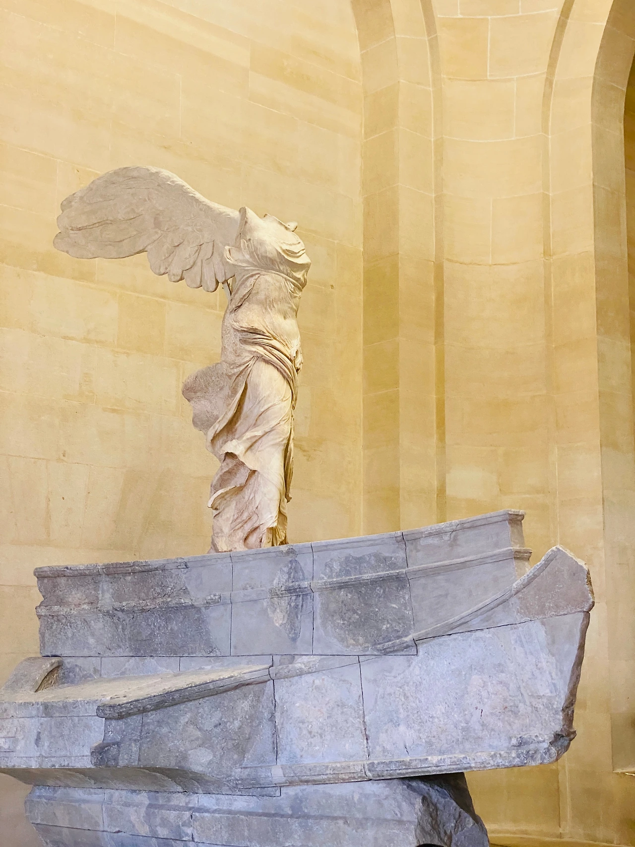 헬레니즘 시대의 대표적인 그리스 조각으로서 그리스 로마 신화 속 승리의 여신인 니케를 묘사한 작품입니다. 150여 년 전 아테네 에게해, 사모트라케 섬에서 150m에 달하는 허리, 몸통, 가슴, 날개 조각상 파편이 발견됩니다. 발견 당시엔 형채를 알 수 없는 파편 덩어리에 불과했는데 루브르의 복원 작업 큐레이터들의 15년간의 협업으로 1879년 루브르에서 첫 전시대에 오릅니다. 지중해의 부드러운 바람을 마주하며 뱃머리 끝에 아름답고 우아한 날개를 펴고 착지하는 여신을 마주하면 탄성이 절로 나옵니다. 우리는 이 역동적이고 힘이 넘치는 모습을 한참이나 넋을 잃고 바라보게 되지요. 머리도 팔도 없지만, 옷자락의 주름과 날개 끝의 떨림은 여전히 바람을 품고 있습니다. 승리는 완전함에서 오는 것이 아니라, 결핍 속에서 더욱 강렬히 드러난다는 사실을 일깨웁니다. 작품을 보며 예술이 단순히 ‘보는 것’이 아니라 ‘느껴지는 힘’ 임을 알아차리게 됩니다. 승리의 여신 니케는 실물로 보면 정말 아름다워, 보고 또 보고, 또 보게 되요. 기원전 어느 누군가의 작품 파편들을 모아 이렇게 신비롭고 아름다운 조각으로 재탄생시킨 루브르의 솜씨는 말해 모해. 심장이 두근거릴 만큼 탁월합니다
