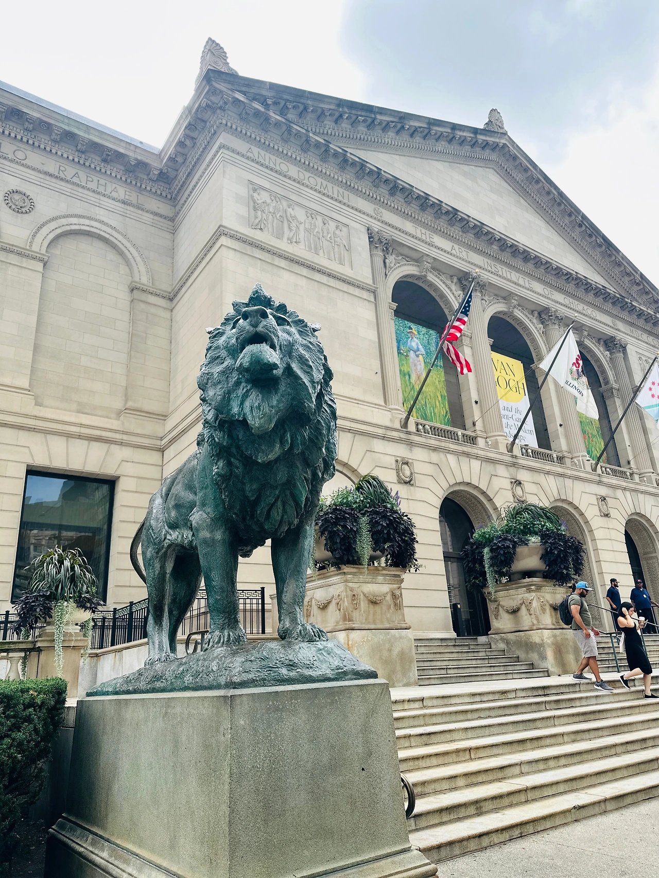 그 길을 따라 조금 더 걸으면, 이 도시의 심장, 시카고 미술관 Art Institute of Chicago이 보입니다. 미술관 입구의 청동 사자상은 고전적인 석조건물의 위엄을 한껏 더해줍니다.
