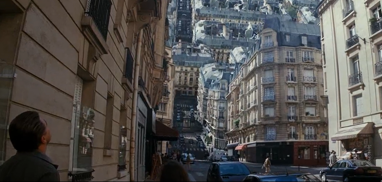 영화 〈인셉션〉에서 제가 가장 숨을 멈추고 본 두 장면이 있어요. 파리를 사랑해서일까요. ^^ 아리아드네가 처음 꿈의 세계를 설계해보일 때, 그녀는 파리의 거리를 그대로 복제해 세운 뒤, 그 도로를 하늘 방향으로 접어 올립니다. 아름다운 카페와 아파트들이 종이 도면처럼 탁! 하고 꺾여 올라가던 순간.