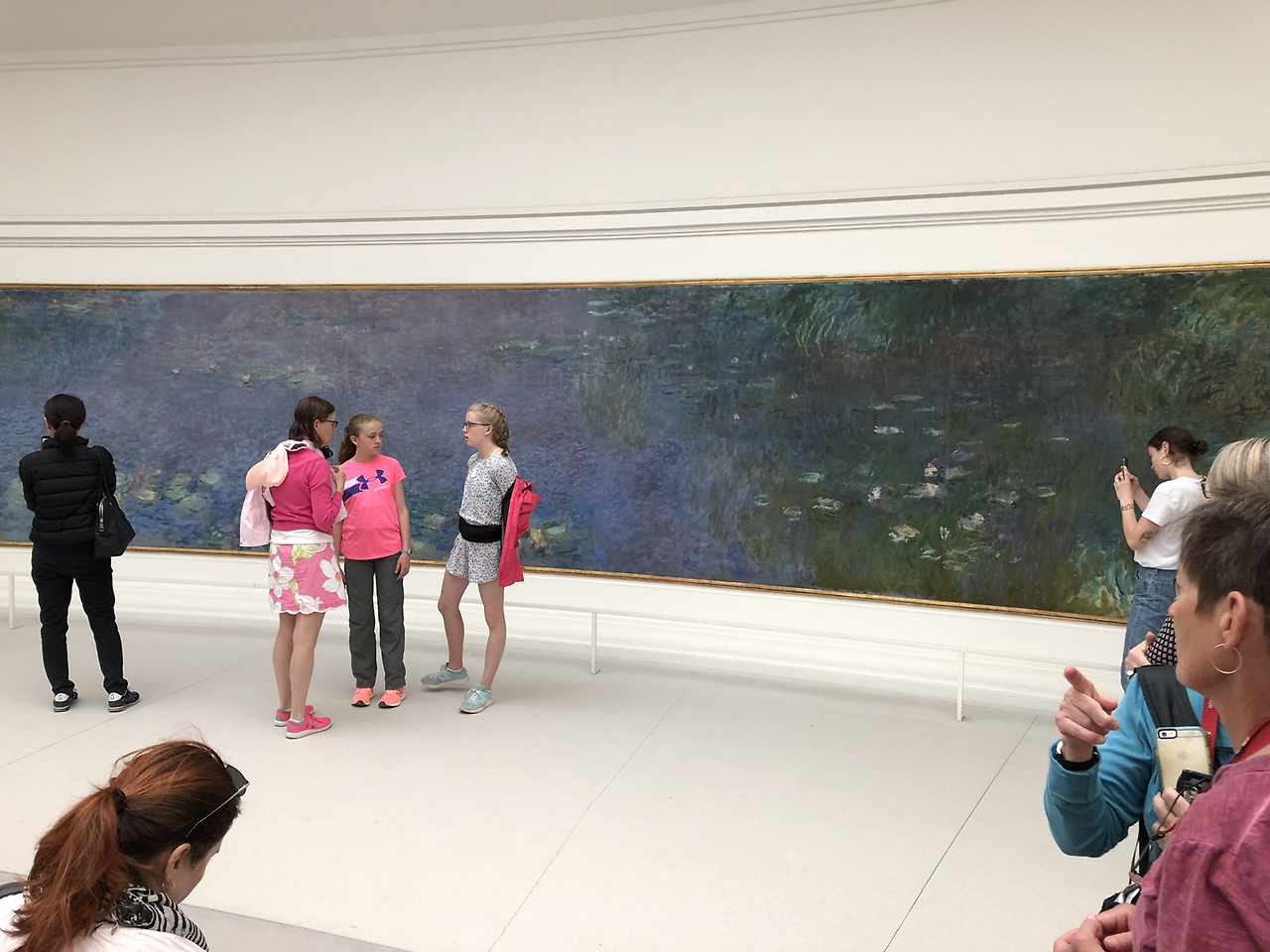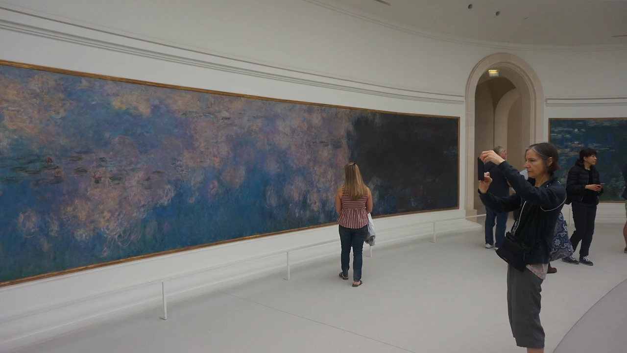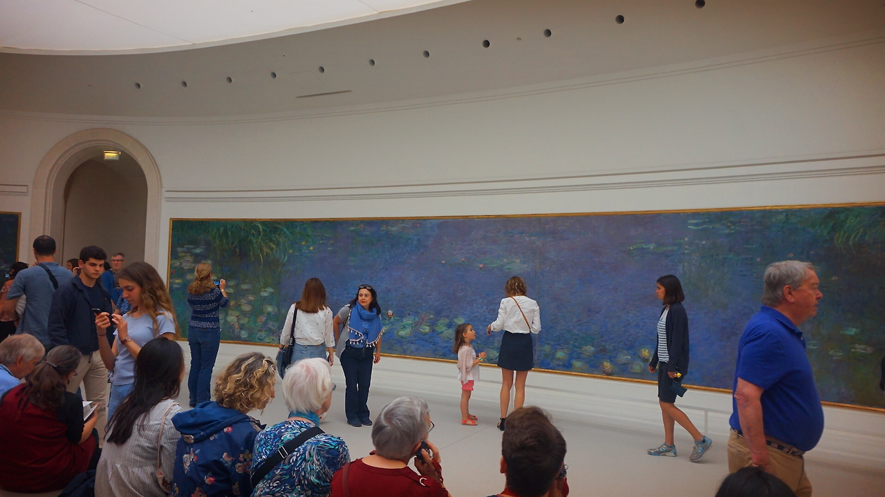 모네의 수련, 파리에 갈 때마다 들렀던 오랑주리 미술관. 자연채광으로 잘 알려진 참 산뜻하고 아담한 공간입니다. 제1차 세계대전의 종전을 기념하기 위해 모네는 수련 연작 2점을 국가에 기증하기로 합니다. 오랑주리 미술관의 타원형 형태에 맞춰 이 연로한 화가는 특별한 프로젝트에 들어갔지요. 당시 모네는 백내장을 앓고 있어서 이 작업을 완수하기까지 자신과의 힘겨운 싸움을 해야 했어요. 오랑주리 미술관 모네의 방으로 한번 들어가 볼까요?