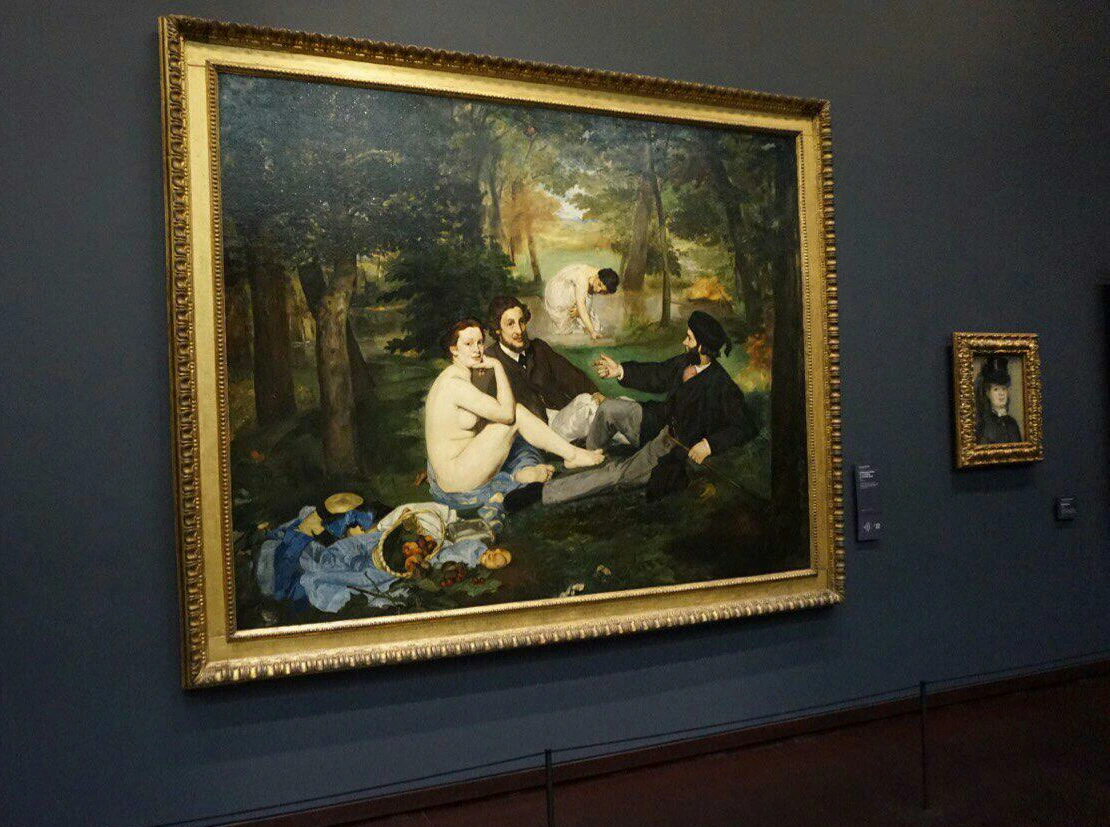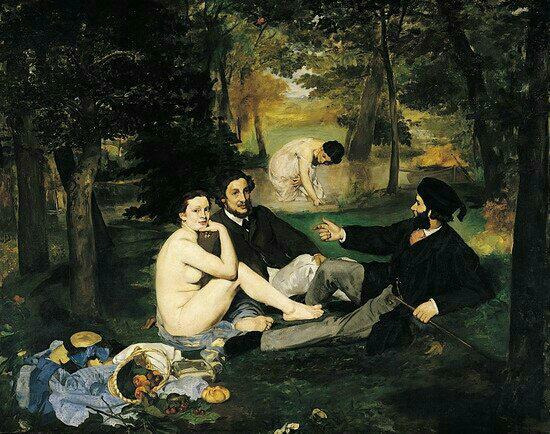 대낮에 신사다운 정장을 입은 두 남자 사이에 나체의 여인이 정면을 응시한 채 앉아 있습니다. (그림 속 모델은 마네의 그 유명한 올랭피아의 빅토린 뫼랑입니다. 그림에서는 창녀로 그려졌지만 실제로는 여류화가이기도 했죠. 제가 좋아하는 그림 '생 라자르 역에서'의 모델 역시 그녀입니다.) 실제 부르주아 사이에 흔히 있는 풍경이었겠지만 1863년 당시엔 그들의 삶을 적나라하게 그림으로 표현한다는 거 자체가 대단히 불편하고 절대로 '잘 그린 그림'으로 용납될 수 없는 일이었죠.