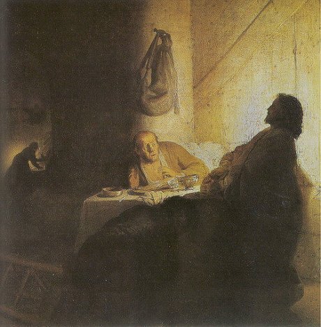 미술사에서 세익스피어라는 별명을 가진 렘브란트는 인류사상 가장 놀라운 사건이었던 예수가 부활 후 엠마오에서의 저녁식사에 대한 그림을 여러점 남겼습니다. 그 중 잘 알려지지 않은 이 그림. 도대체 우리에게 무슨 일이 일어났는지 영문을 아는지 모르는지 그저 소일거리로 바쁜 저 멀리 여관의 주인의 모습도 보입니다. 이 남자가 빵을 떼어 나누는 순간 동석하던 제자들의 눈이 밝아져 그가 마침내 자신의 주님이란 것을 알게 되지요. 발 아래 무릎 꿇은 제자와 빛에 반영된 예수의 얼굴을 놀란 눈으로 응시하는 또 한 명의 제자. 와. 정말 저의 메마른 영혼에도 환한 빛이 들어 오는 찰라입니다.