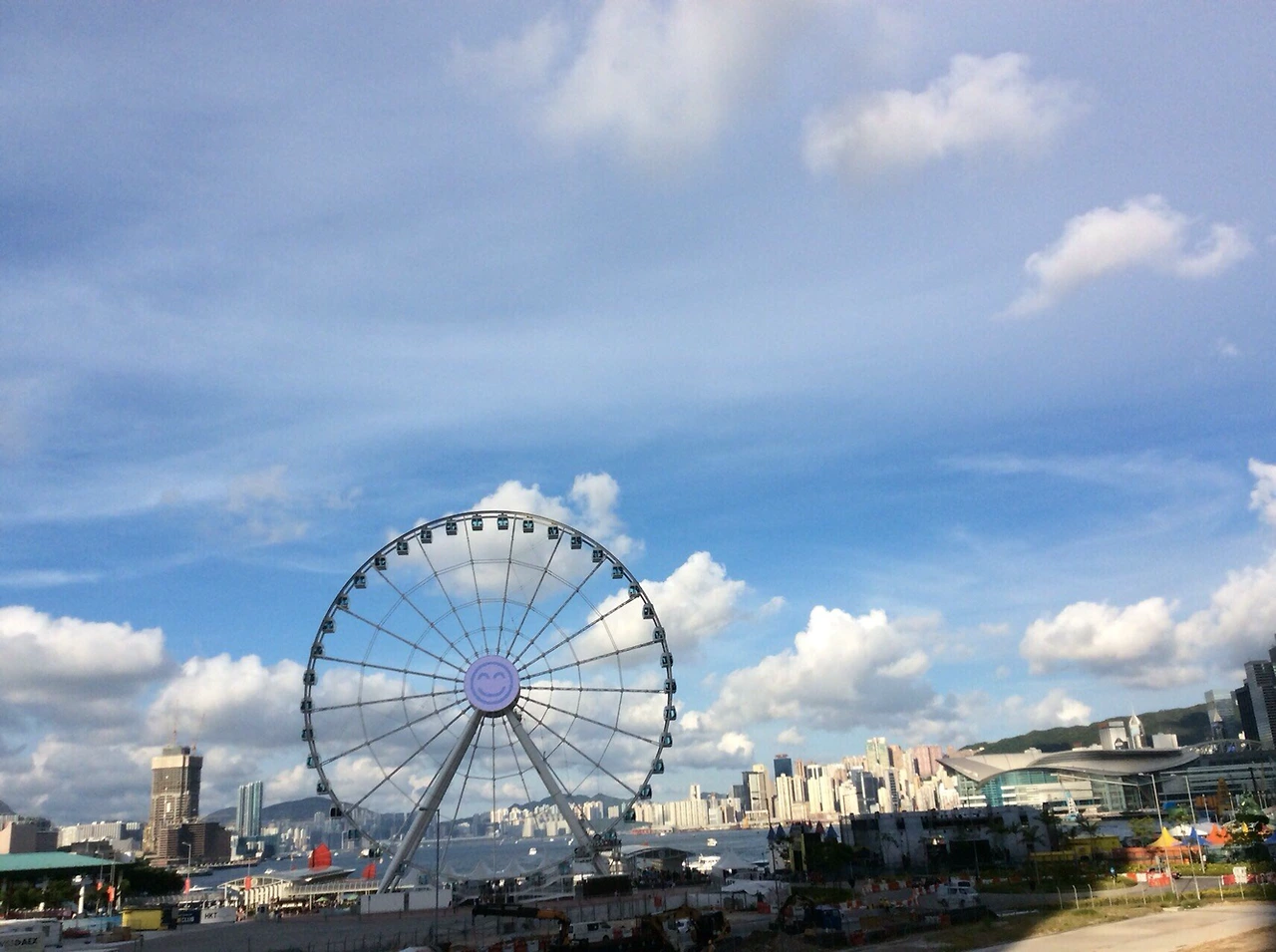 센트럴 선착장과 연결된 긴 다리와 저멀리 침사추이가 보여 내부에서 바라본 경관도 좋습니다. 런던아이 처럼 생긴 대관람차 Observation Wheel Hong Kong 도 인상적이고요.